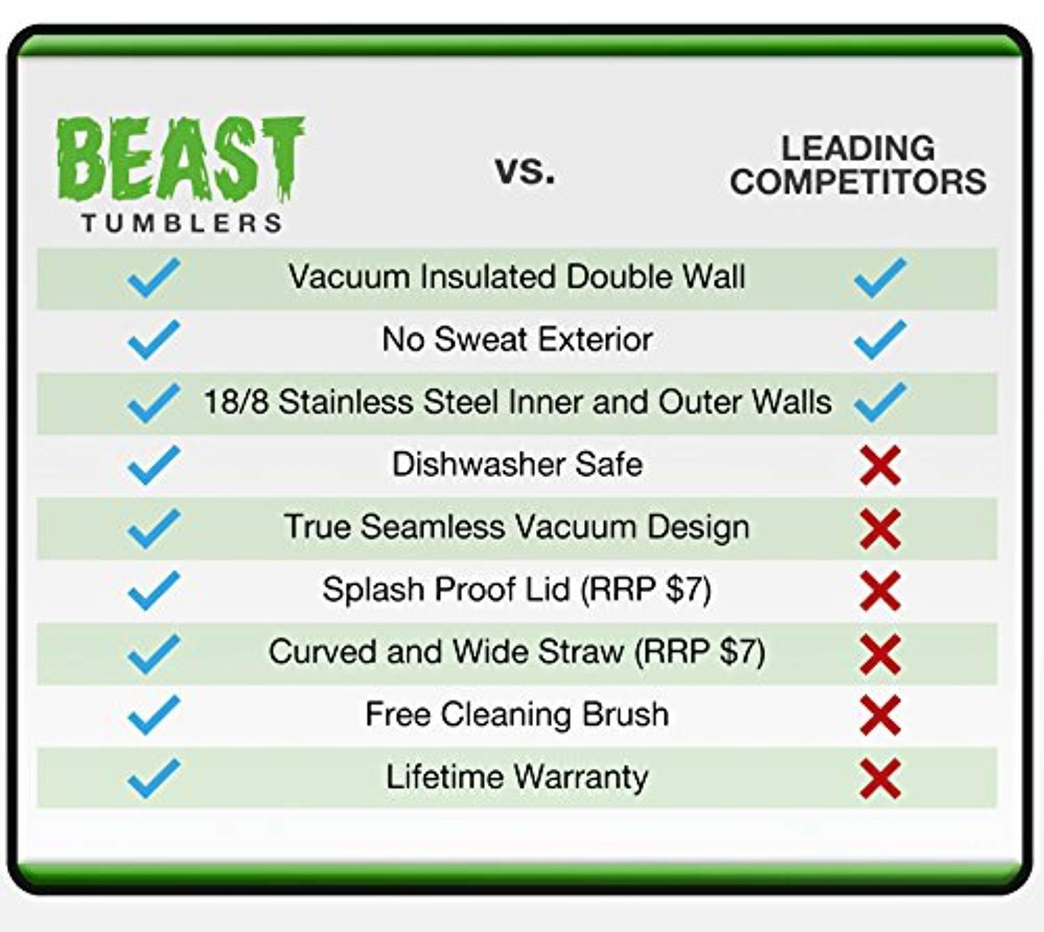 ★ EXCLUSIVE BONUS BEAST BUNDLE - Offering unrivaled value for money: 2 unbreakable steel straws, a free straw brush to make cleaning even easier & 1 splash proof lid presented in a beautiful Gift Box. With so many second-rate tumblers available on the market we wanted to set ourselves apart and be the best! #1 INSULATION & TEMPERATURE RETENTION - Over engineered and tested against Yeti and other leading brands. Our Tumblers match performance all day long and with our splash proof closable lid you can keep your drinks insulated and protected for longer! #1 PREMIUM QUALITY - While other steel tumblers out there may use a cheaper 201 steel finish; we’ve cut no corners! Made only from the Highest Quality Premium 304 18/8 Food Grade Stainless Steel. #1 SUPERIOR FINISHING INSIDE & OUT – Your tumbler will always feel smooth to the touch with a sweat-free design, and will keep its stylish colorful finish due to its long-lasting powder coating. No rust or scratches like painted exteriors. An electro-polished interior will ensure your cups remain pure, imparting NO unwanted flavors, giving you a clean tasting drink every time! #1 LIFETIME GUARANTEE & 100% SATISFACTION - Yes! All Greens Steel Products come with a LIFETIME GUARANTEE! 100% Satisfaction or your money back. Order now and put us to the test! Don't settle for any less.