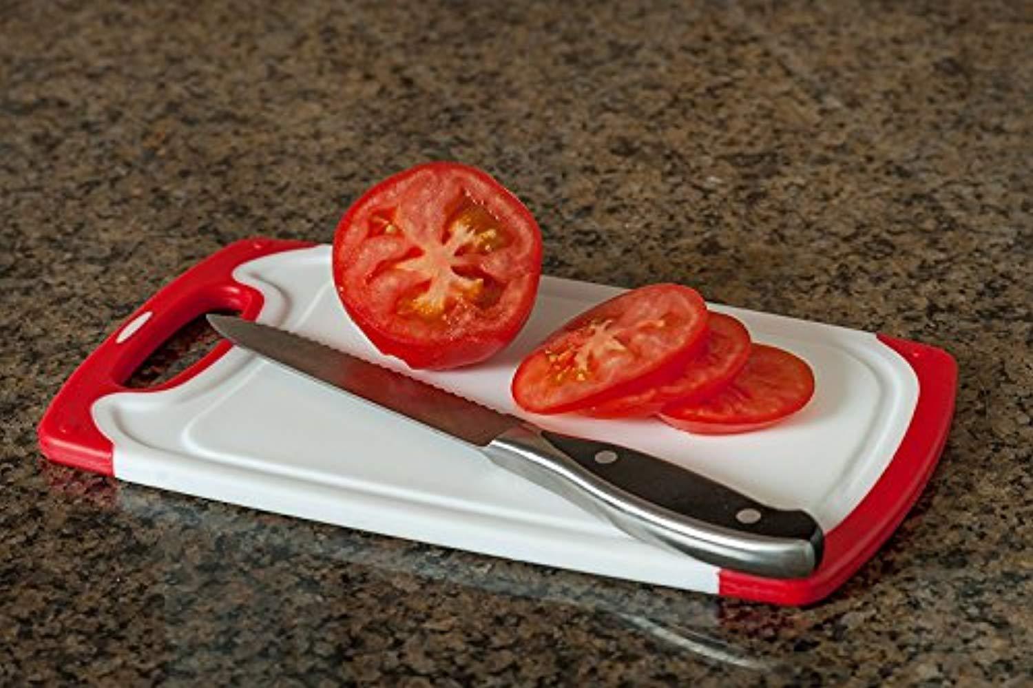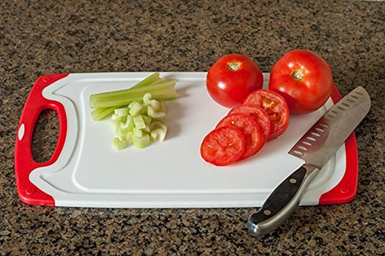 - Nonskid handles keep boards firmly in place; juice grooves keep liquids on the board so your countertop stays clean!