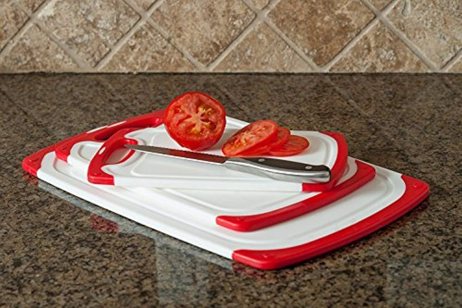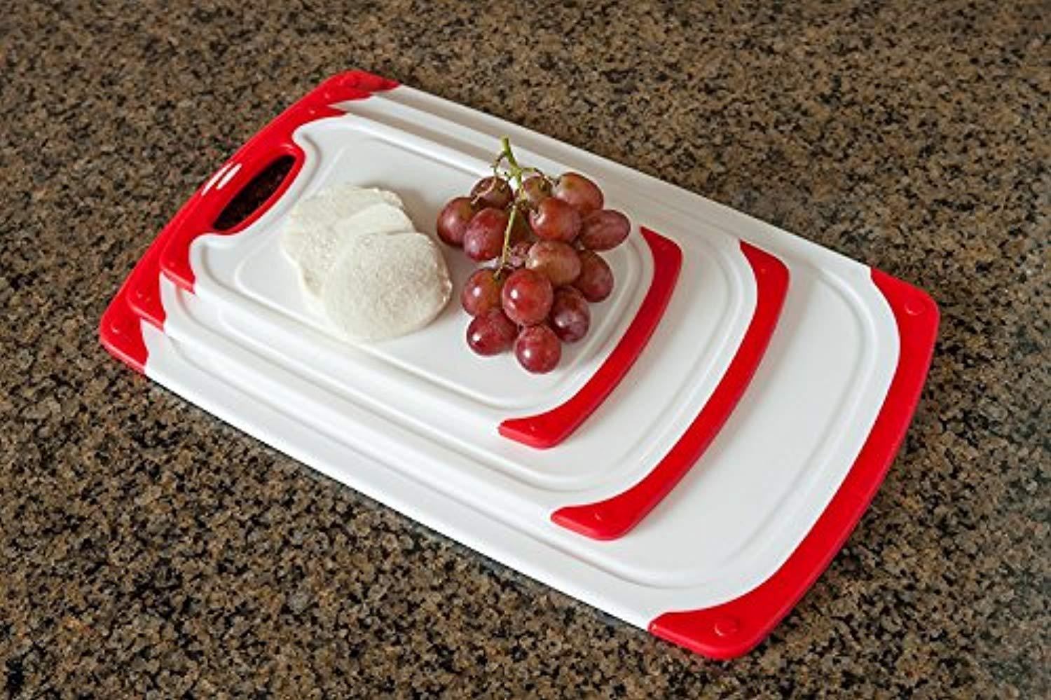 - Three conveniently sized polypropylene boards: 15.5 x 9.5 in., 12.5 x 7.75 in., 10 x 5.75 in. Small, medium and large options allow you to be flexible with your food prep!