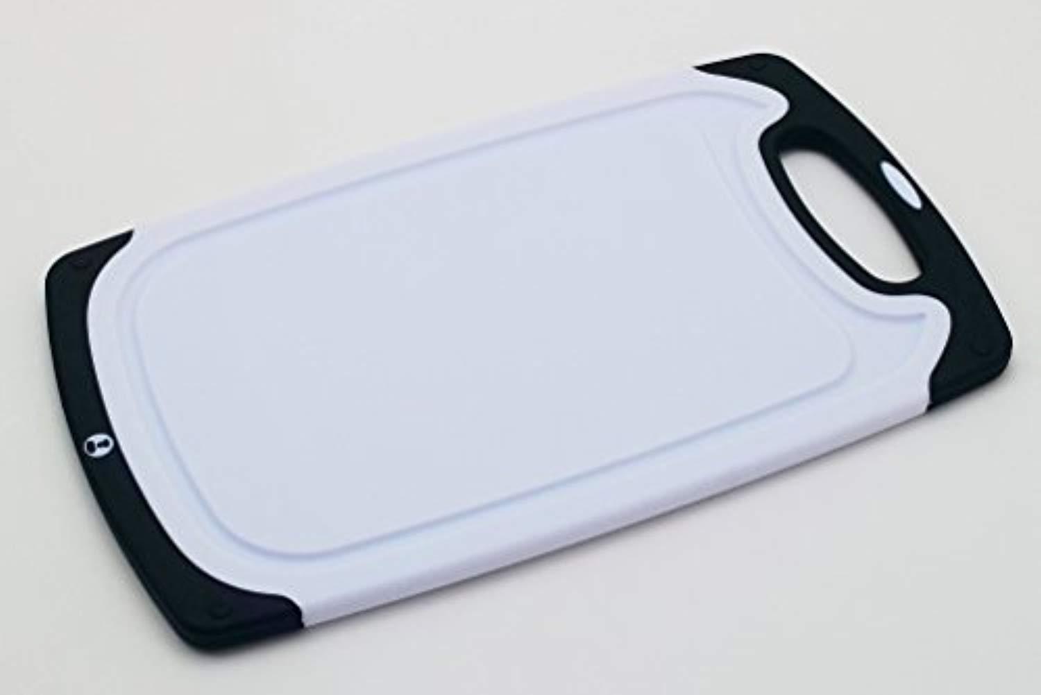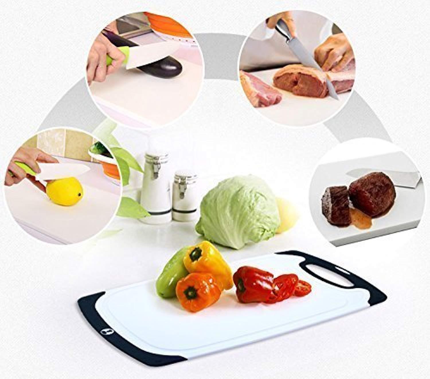 - Design features include a deep juice groove on one side and flat surface on the other side with non-slip edges made of thermal plastic rubber for easy handling and reduce board movement on kitchen work surface