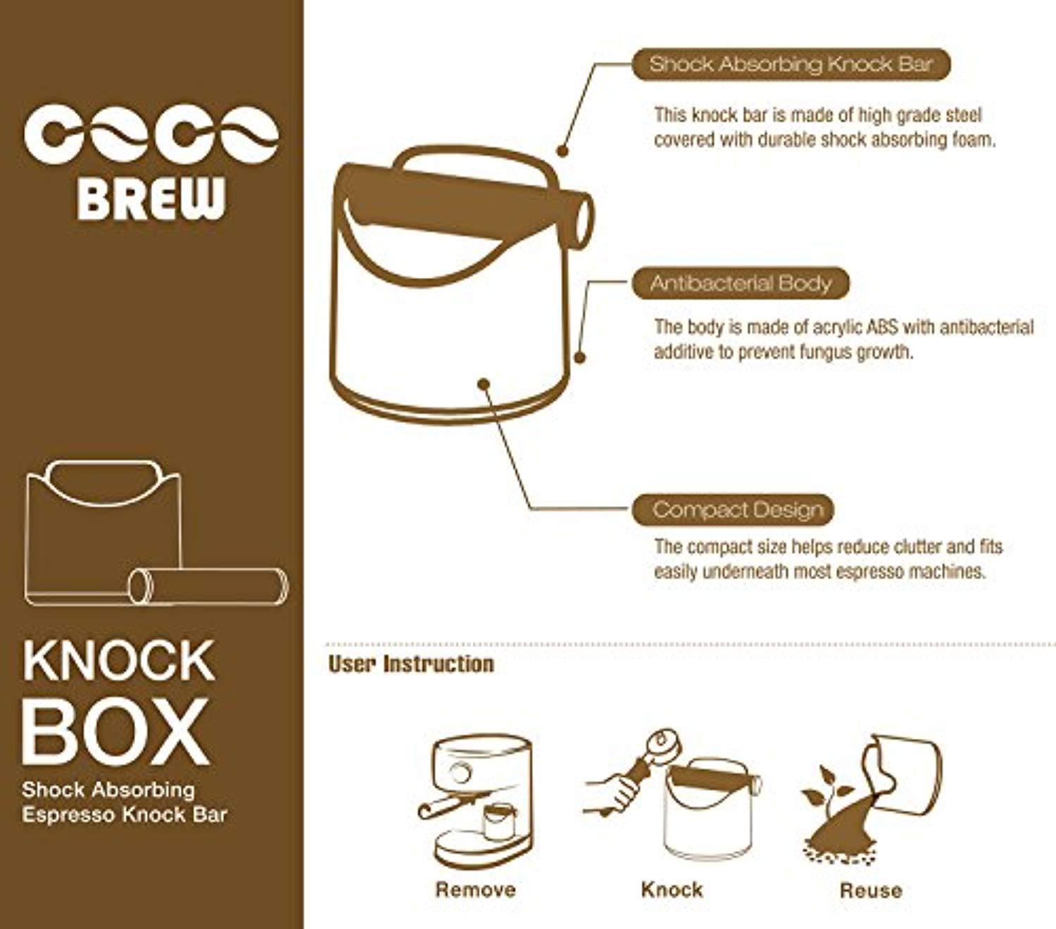✅ PERFECT SIZE - The 4.7inch size is perfect for storing underneath most common espresso machine brands like Breville, DeLonghi, and more. The capacity is large enough that you don't have to empty the grinds it too often. ✅ ANTIBACTERIAL - Manufactured out of a special antibacterial plastic to prevent bacterial growth. ✅ DETACHABLE KNOCK BAR - The steel bar is made from high-quality steel and wrapped with a special foam that will absorb most of the shock. ✅ SLIP RESISTANT - Rubber grip on the bottom of the coffee knock box will keep it from shifting during use. ✅ SATISFACTION GUARANTEED - We’re not happy until you are! For any defects in the materials or craftsmanship, please contact us and we will be glad to assist you.