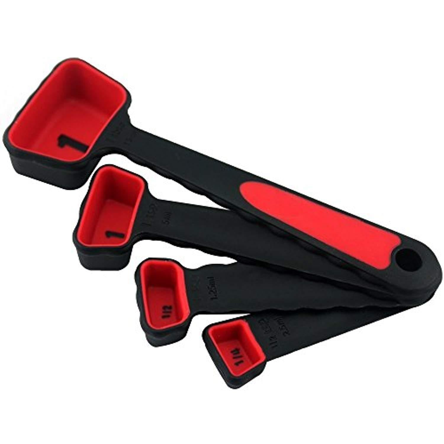Set contains 4 collapsible silicone measuring cups and 4 red measuring spoons High quality food grade silicone cups pop into shape for use and collapse for easy storage Measuring cups may be removed from the handle, spoons can not be separated Cups measure 1 cup (250ml), 1/2 cup (125ml), 1/3 cup (80ml) and 1/4 cup (60ml) Spoons measure 1 Tbs (15ml), 1 Tsp (5ml), 1/2 Tsp (2.5ml) and 1/4 Tsp (1.25ml)