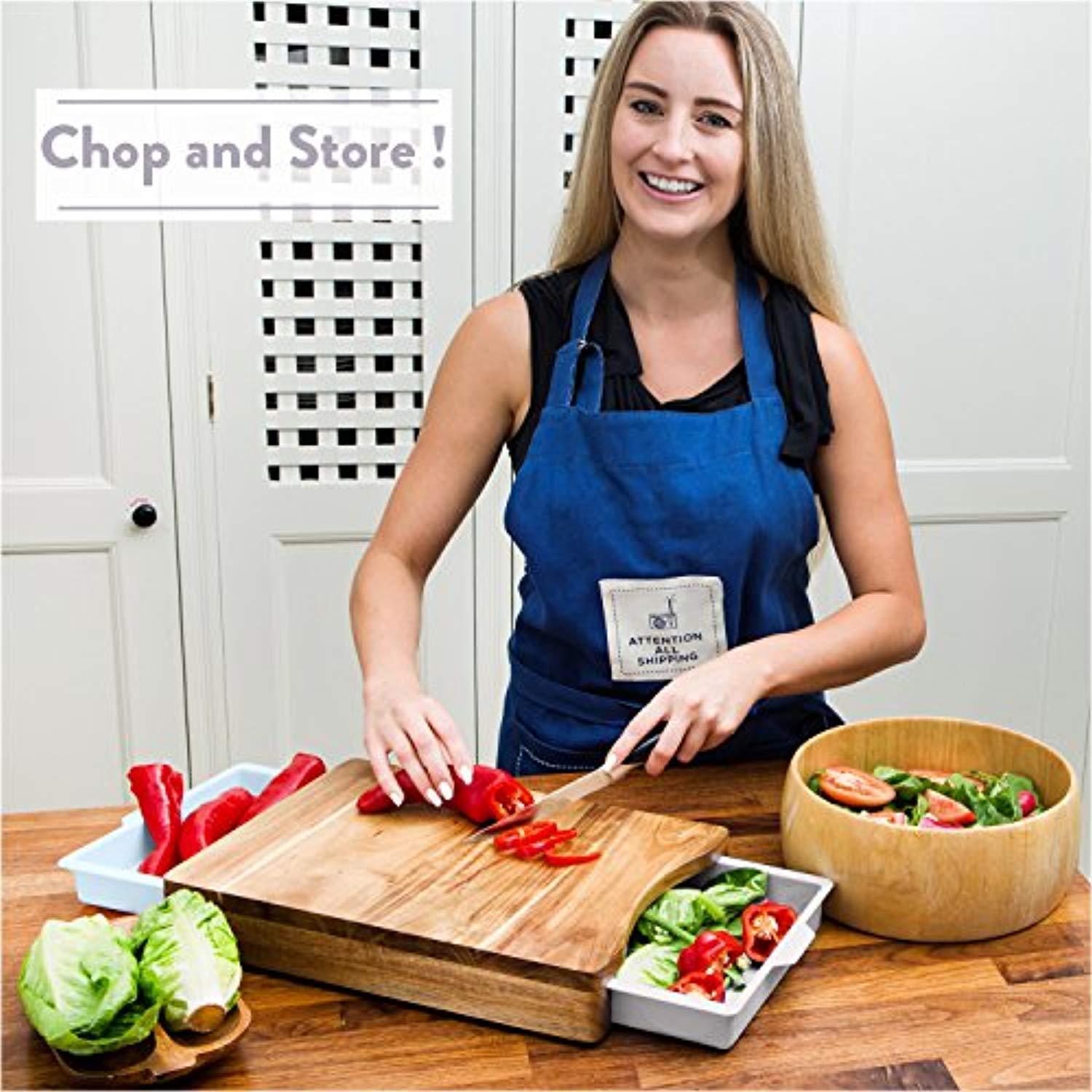 BETTER THAN the Cup Board Pro - Mess-Free Bamboo Cutting Board with Cup Tray (As Seen on Shark Tank) - UNLIKE BAMBOO CUTTING BOARDS - Acacia Wood Boards are Naturally Antibacterial - Durable - Water Resistant - Remain Splinter free and are Favored by Top Chefs LARGE ACACIA WOODEN CUTTING-BOARD with 2 drawers 14”x10x2” - Versatile as a Bread Board or as a Cutting Board for Meat CUTTING BOARD WITH DRAWER - Easily Transfer Chopped Foods to Stove Top - Easy Clean BPA Free Food Trays are Microwave Dishwasher & Freezer Safe - Stow Easily under Butcher Block Island Wooden Chopping Board with Chop and Store Food Savers or Chop and Trash Plastic Waste Color Coded trays - Organic Wood - 100% Food Safe - No Formaldehyde - Satisfaction Guaranteed