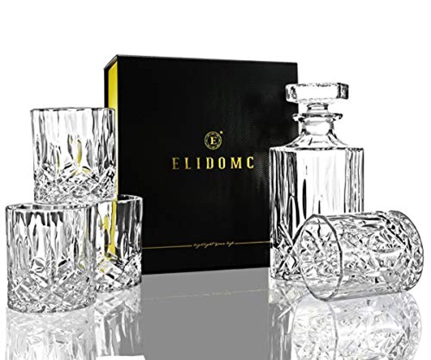 Ornate Whiskey Decanter Set Include Timeless 35 OZ Crystal Whiskey Decanter And 4PC Sophisticated 11 0Z Whiskey Glasses. Compliment Your Bar With Classic Diamond And Wedge Cuts Whiskey Glass Set. The 9" High Crystal Decanter With Crystal Stopper And 3.6" High Crystal Glasses All Providing Classic Elegance. Whiskey Glass Is Prefect For Ice Ball. This Crystal Whiskey Decanter Set Perfect For Whiskey, Bourbon, Scotch, Vodka, Bourbon And Other Liquor.Perfect Gift For Any Whiskey Enthusiast Or Scotch Drinker Or As An Christmas Gift For That Special Person. True Beauty And Extra-Value Whisky Glass Set Is Only Found in Elicomc, These Stunning Bourbon Glasses Comes In ELIDOMC Inscribed Embossed Magnetic Closure Gift Box Which Can Be Well Protected During Shipping Or Storing. High Quality 100% Lead Free Crystal Decanter And Whiskey Glasses, Elidomc 5Pcs Whisky Decanter Set Is Made From Lead Free Ultra-Clarity Glass,This Whiskey Bar Set Keep Your Drink Safe, Dishwasher Safe, Recommed Hand Wash.