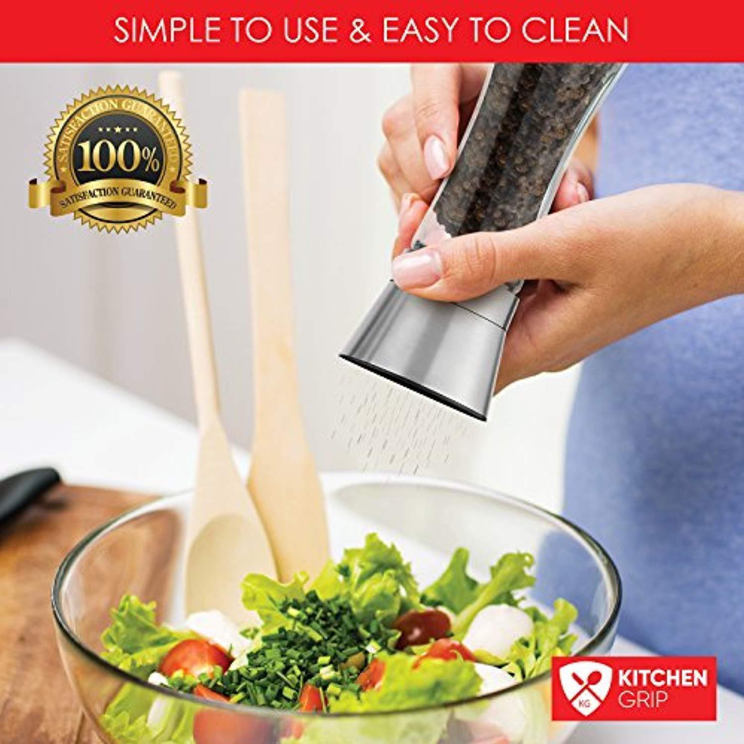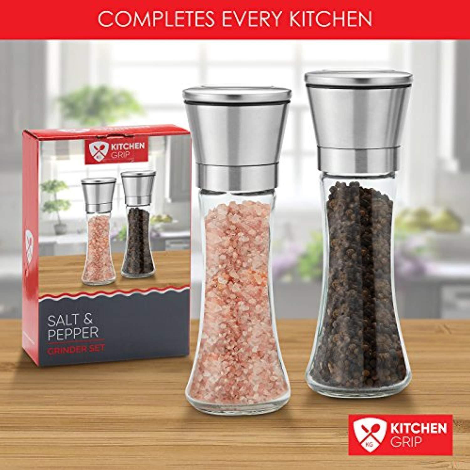 KitchenGrip Salt and Pepper Grinder Set Of 2 - Stainless Steel Top, 6 Oz Glass Tall Body - Salt and Pepper Mill For Fine and Coarse Grinding, 5 Grade Adjustable Ceramic Rotor, Salt and Pepper Shakers