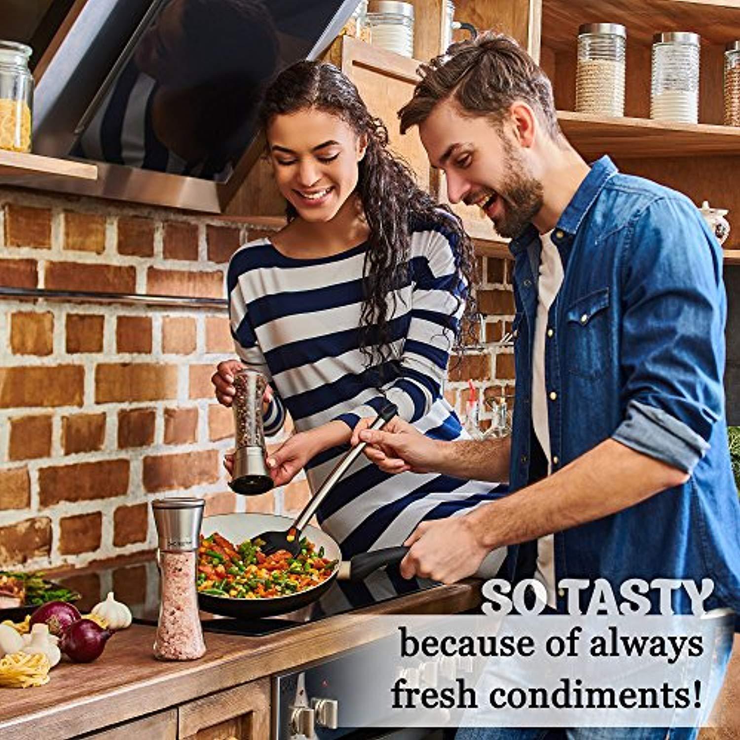 - ✅ GET THE PERFECT GRIND: This pair of identical salt and pepper mills is fitted with a high quality ceramic grinder that is non-corrosive, doesn’t absorb odors, and gets the job done every time. Choose between 5 levels of grind from coarse to fine by simply adjusting a plastic knob at the top.
