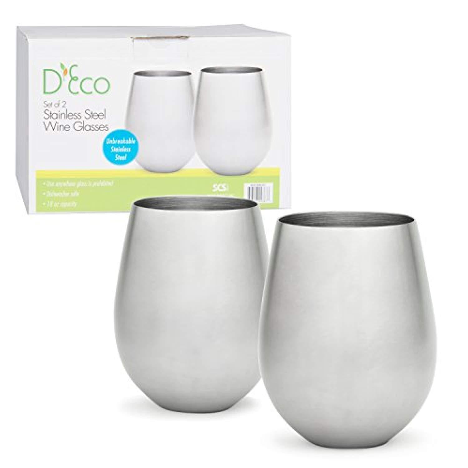 Stainless Steel Stemless Wine Glasses, Set of 2, 18 oz Made from durable 18/10 stainless, unbreakable, shatterproof and BPA Free with brushed finish Maintains wine temperature - white wine stays cooler, longer 100% Dishwasher safe Perfect for pools, decks, boats, and entertaining