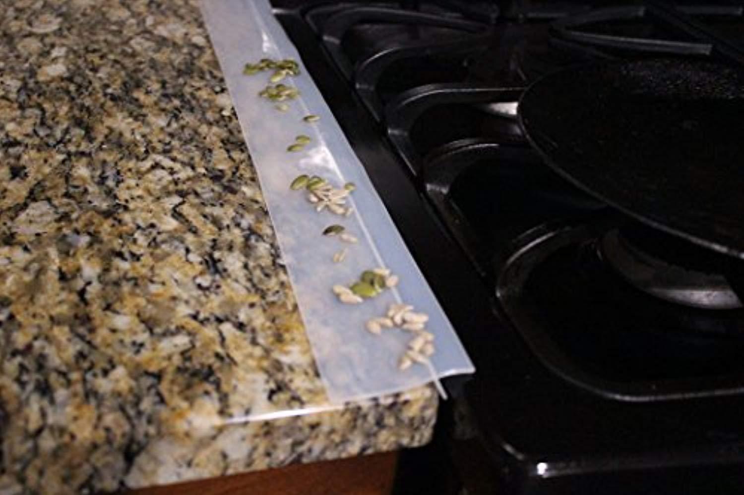 ENDS PROBLEM OF MESSES AND CRUMBS FALLING INTO GAP OF KITCHEN OVEN AND COUNTERS. Eliminates Sticky Messes and Crumbs from falling between your stove and counter top gap spaces with the silicone oven stove top gap stuffing cover protector that fits over open gap spaces in homes and rv's and motor homes. SET OF 2 FOR BOTH SIDES OF OVEN TOP AND STOVES. Set of 2 makes it convenient to use one on each side of ovens and stores. Durable heat resistant uniersal slicone oven seam protector gap filler stuffing cover can be used on many kinds of electric, gas, glass top kitchen ranges, stoves and ovens in rv, motor homes, apartments and homes. INSTALLS INSTANTLY. NO TOOLS OR EQUIPMENT REQUIRED. Slides into place between your stove and counter. Due to the nature of the material the gap cover may not sit straight or flat and may fold upwards, but over time the gap filler folds will settle down due to its own weight and gravity. You may reduce this by soaking the oven seam protector in warm water for some time to loosen up the folds and then using the cover, but still allow it to settle down on its own over time. CAN BE TRIMMED TO FIT TO SIZE. Measures 20" L x 2.5" W x .15" H. The 20-inch heat-resistant silicone strips oven seam gap filler covers can be used full length or easily trimmed to desired size according to the application. Heat Resistant Up to 400°F. Works with almost any type of oven and removes easily for cleaning.