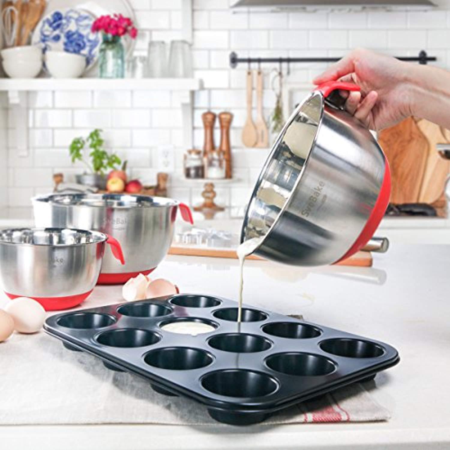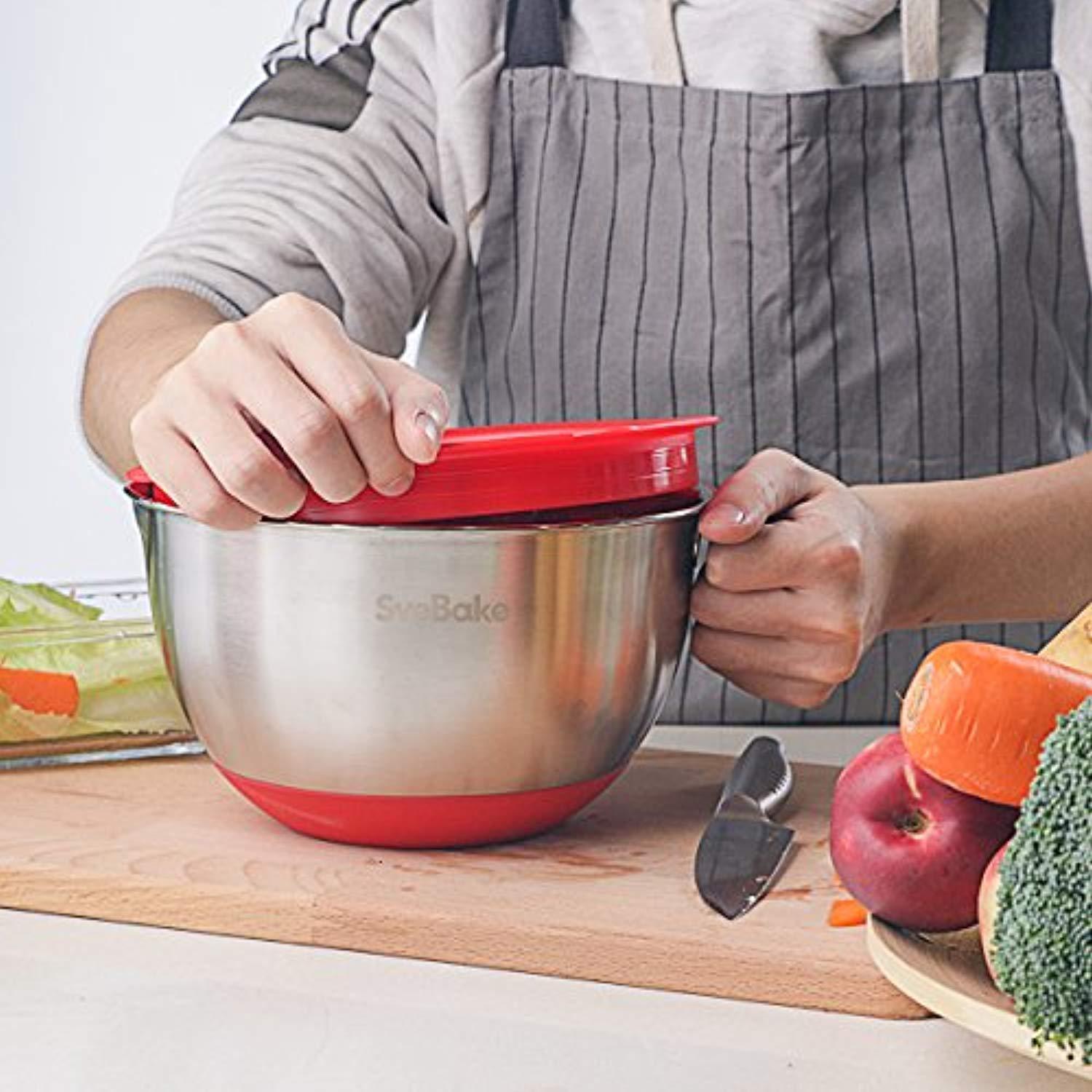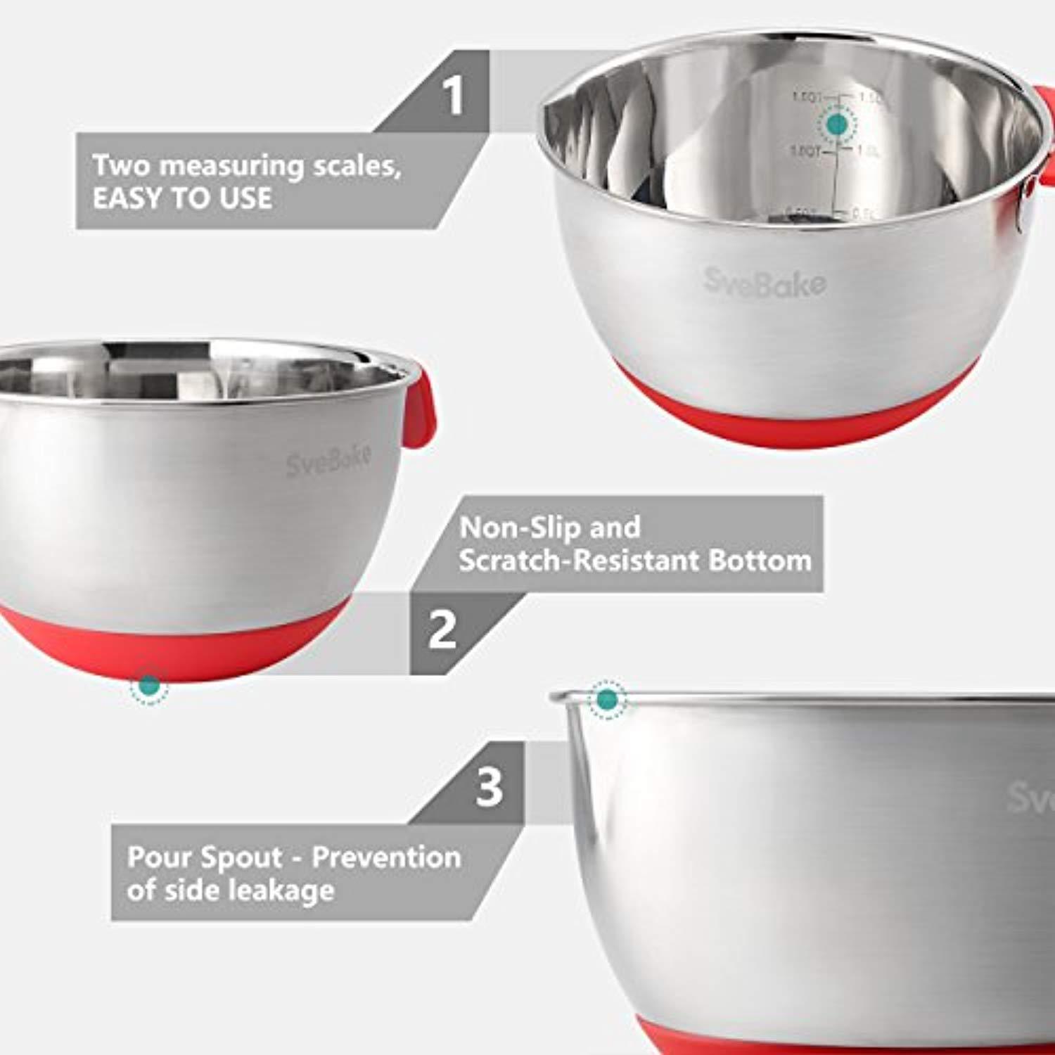 SveBake Mixing Bowls - Stainless Steel Mixing Bowl Set with Handles, Pour Spouts, Non-Slip Base and Graters, Set of 3, Red