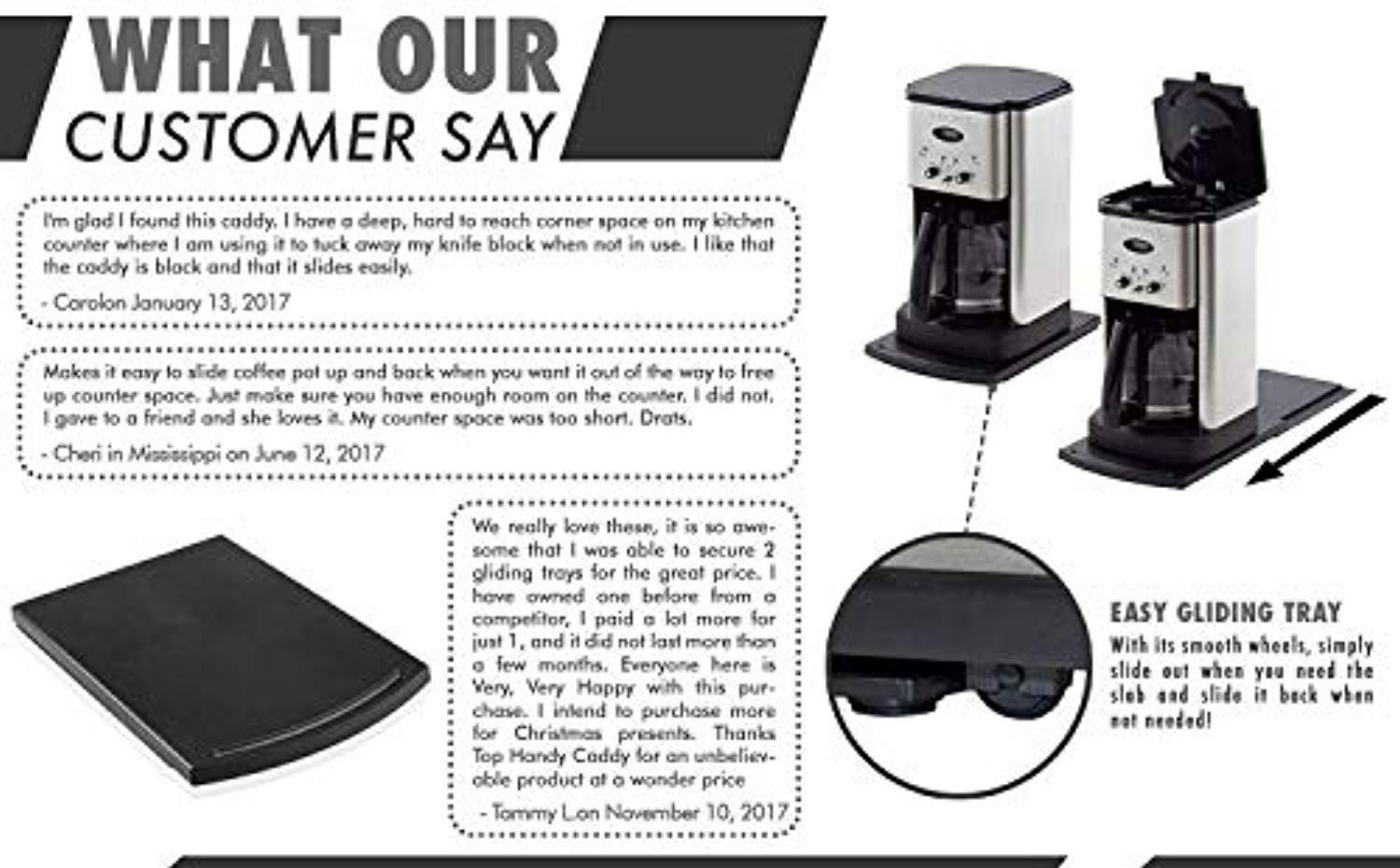 - WHAT OUR CUSTOMERS SAY - With over 240+ 5-star reviews, here is what our beloved customers say, “What's not to love”, “After done brewing, with the handy caddy, it is a simple glide back into place”, “I like that the caddy is black and that it slides easily”, “This works so great with my Keurig coffee maker”, and “Great price, fast shipping, just what I was looking for”.