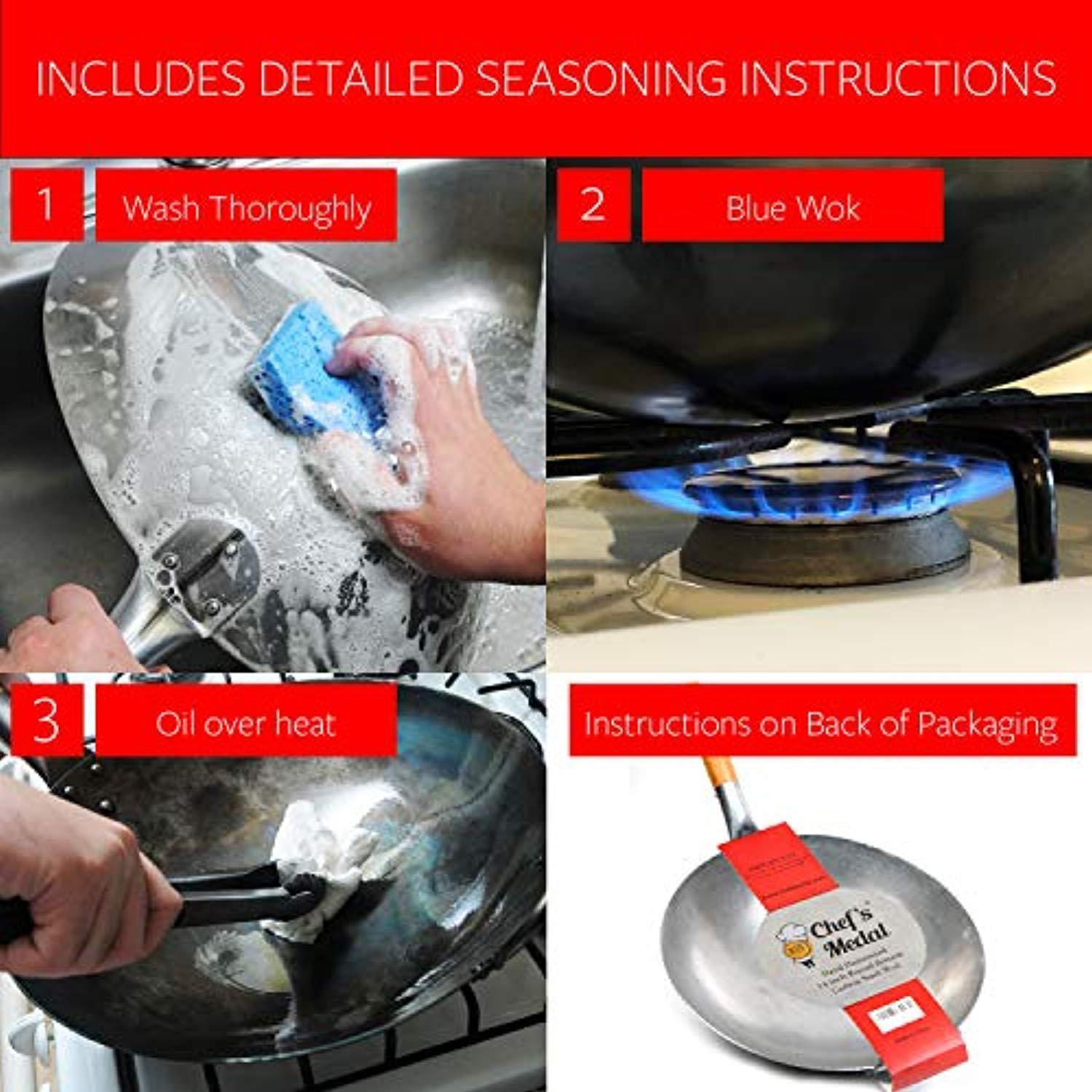 - Instructions are included to season wok to become non-stick – the heating process blues the metal creating a beautiful piece to display in your kitchen.