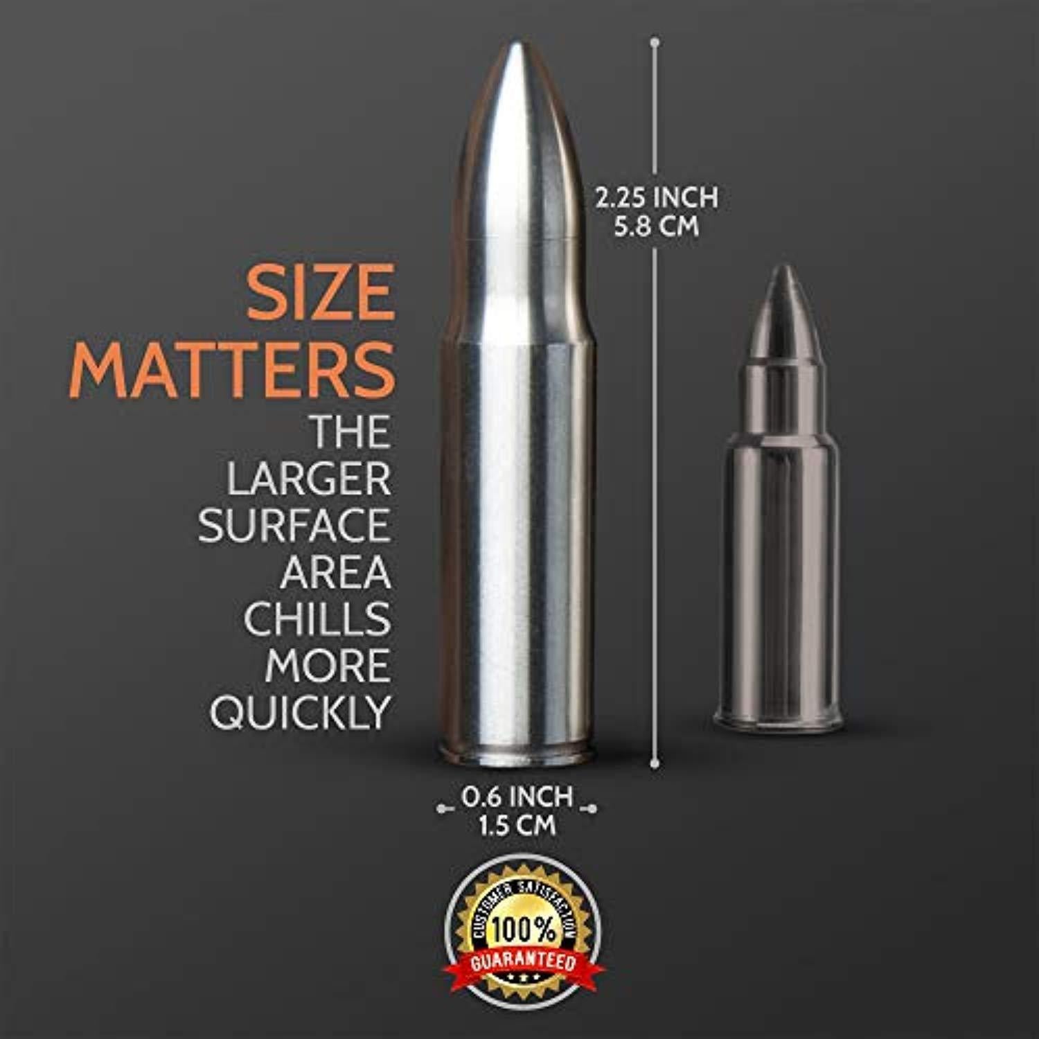 XLARGE -- SIZE DOES MATTER: You have one shot; skip the small, 22-sized bullets because size matters, and the greater the surface area, the quicker to chill. The extra-large chilling bullet rocks are made with antibacterial, corrosion resistant, and FDA approved 304 stainless steel, the perfect material to keep your bourbon cold when it counts. These large chilling whiskey bullets will be part of your collection for a very long time