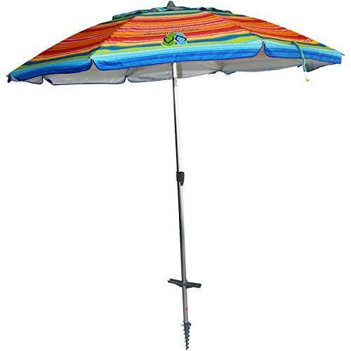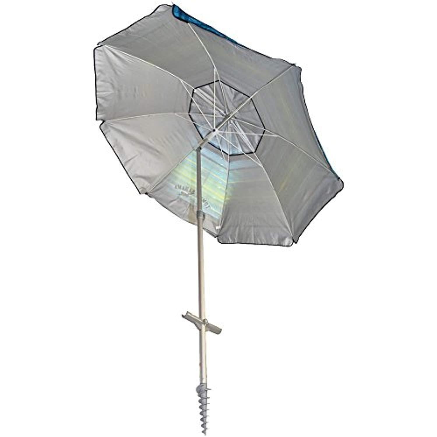 This 7 foot Tommy Bahama Beach Umbrella has an aluminum pole with fiberglass ribs. Vent located on the top of the canopy increases its wind tolerance and gives the umbrella more stability in windy conditions. The Tilting Mechanism allows for easy adjusting to the moving sun. beach umbrella features a silver lining for a UPF 50+ sun protection. The Tommy Bahama Beach Umbrella is comprised of a two-part 1 1/4 in. aluminum pole. bottom pole is designed with a built in sand anchor for easy anchoring. Carrying Case Included! Telescopic Aluminum Pole ; Fiberglass Ribs ; Wind vent