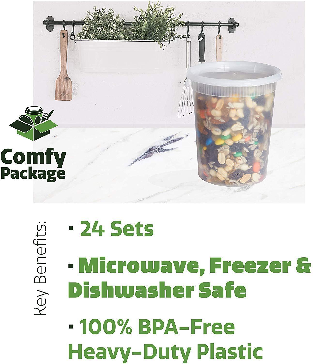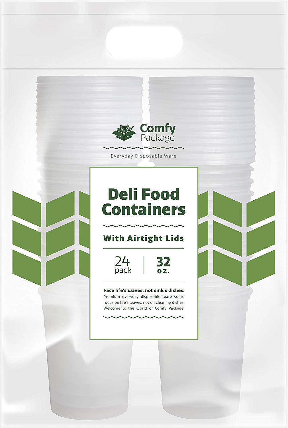 Comfy Package Premium 32 oz. Plastic Food Containers With Airtight Lids which is perfect for meal prep, portion control, food storage and much more. Microwave, Freezer, Dishwasher Safe – Crafted with heavy-duty 100% BPA-free polypropylene plastic which makes it microwave, freezer and dishwasher safe. Leakproof, Airtight Freshness – Each of the 24-pack food storage containers comes with airtight overlapping lids that seals in fresh flavors, odors and liquids. Made For Your Routine - Our food storage Deli Containers With Lids are durable and heavy-duty. Great as travel containers, lunch containers, soup containers, to-go containers and food storage containers. Stackable Storage – We designed and perfected our freezer containers to be stackable and easy to store when not in use. They also make it easier to store in the fridge or transport.