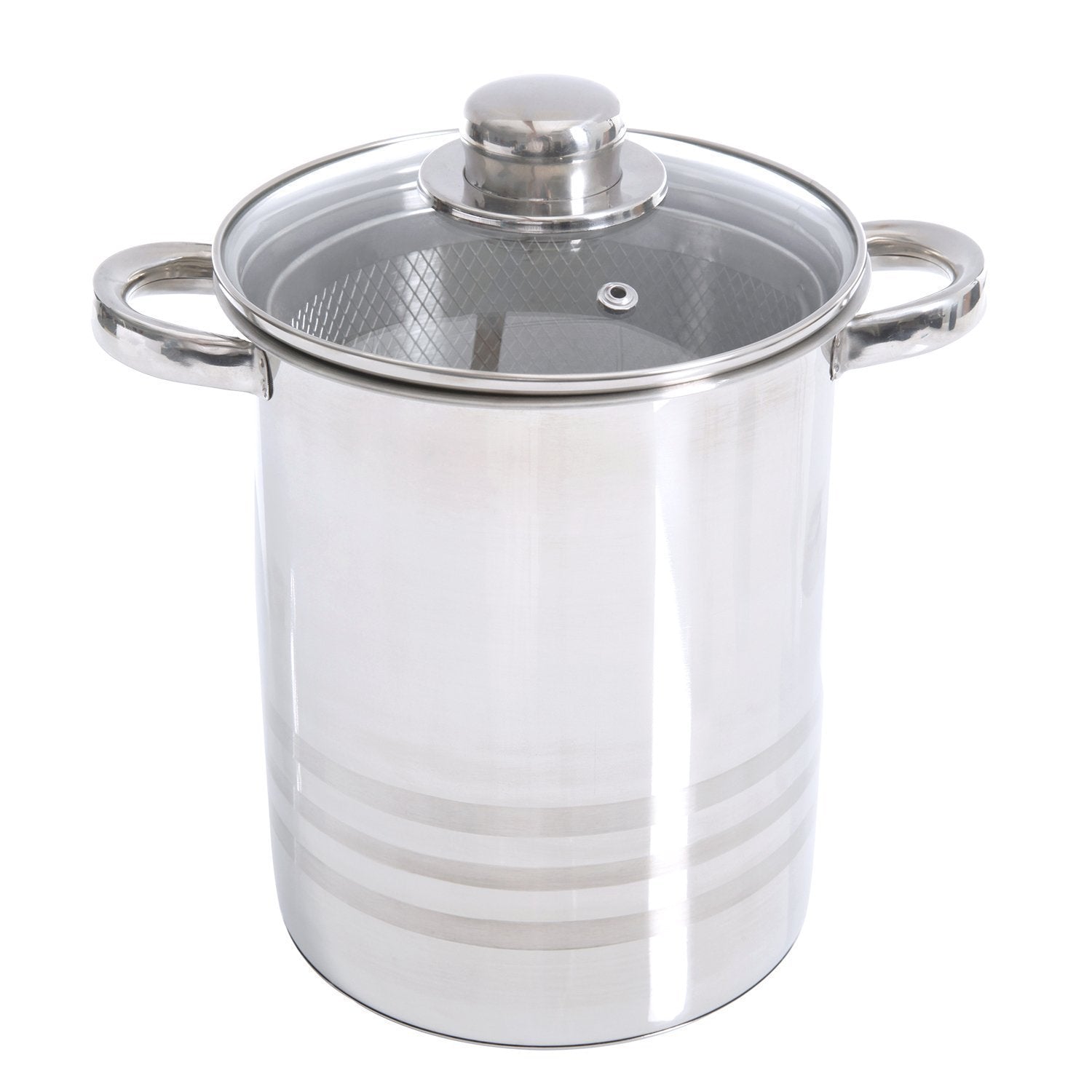 3 piece cooking steamer includes: stock pot, wire insert with handle, and vented glass lid- Insert can also be used a colander Pot holds up to 4.2 quarts and measures Base of steamer cooker is encapsulated for even heating- Stovetop steamer is compatible with gas and induction stoves Buy With Confidence, 30 Day Money Back Returns