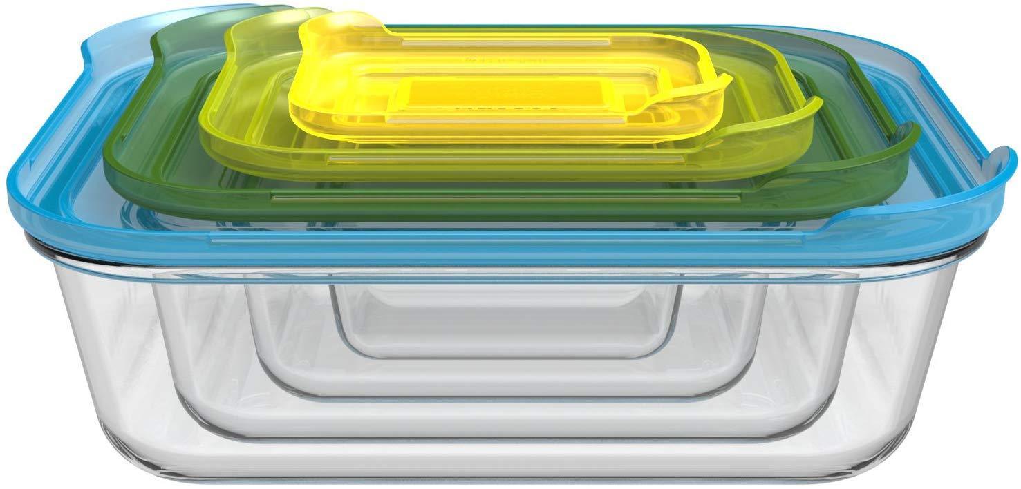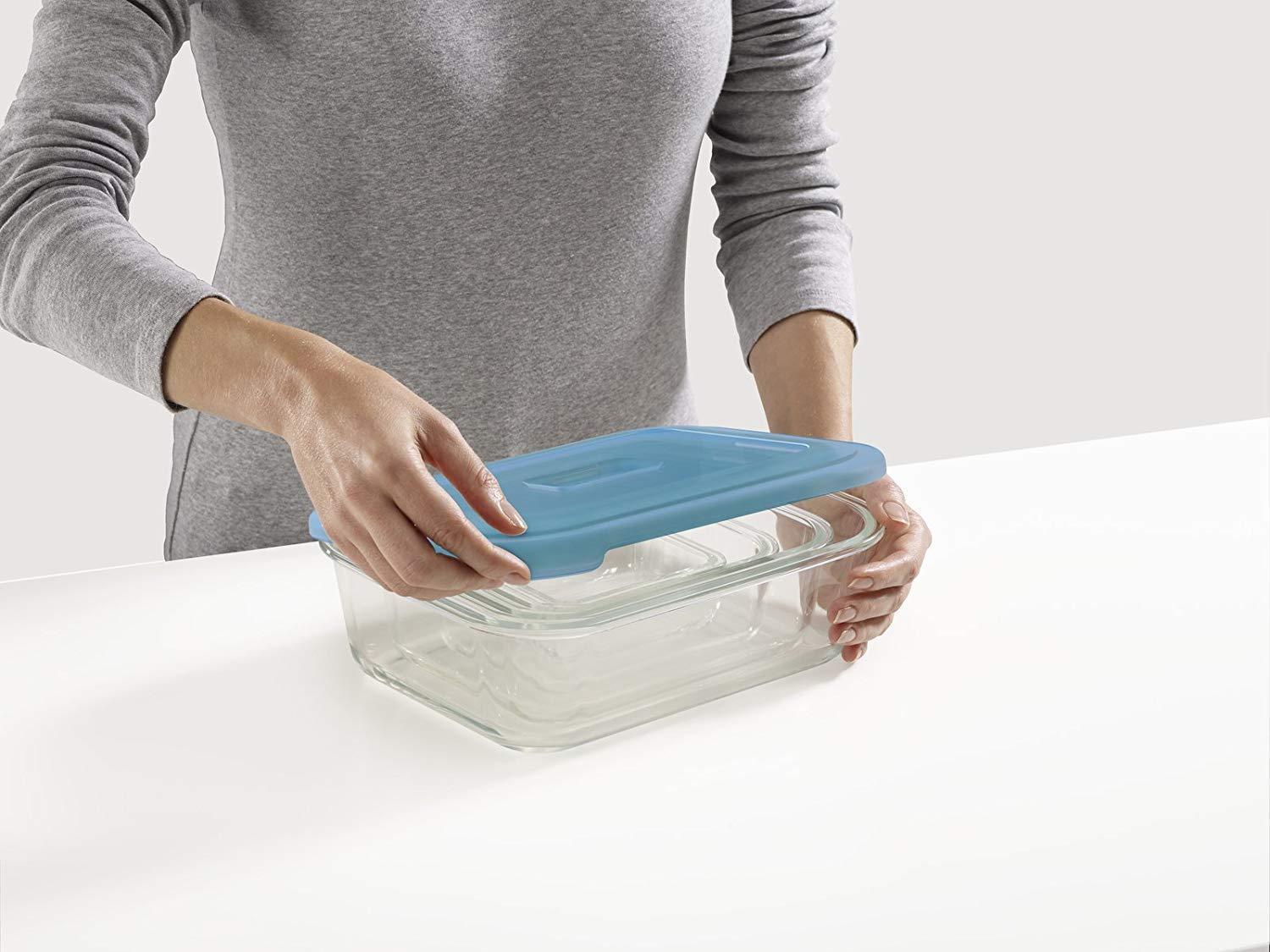 Tough, borosilicate glass containers can be used as baking dish (oven-proof up to 536°F) and food storage containers Compact, space-saving design. Easy-find, snap-together lids with easy-pull tabs