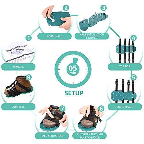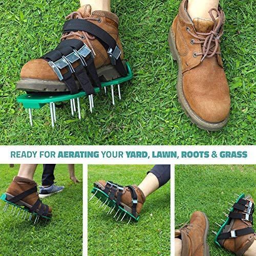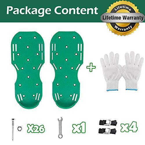 [A GREEN ,GORGEOUS LAWN AND ONE SIZE FITS ALL ] A grand total of 26 heavy-duty spikes will pierce the ground as you walk, breaking up compact soil and maximizing air flow and water absorption. Your lawn’s health will improve from the ground up!Whether your feet are big, small, or somewhere in between, these shoes will fit like a glove. They can easily slip underneath both everyday shoes and heavy duty work boots. [ UPGRADED THIS AERATOR SHOES IN MANY DETAILS] We specially lengthen and thicken 8 adjustable straps and designed 8 aluminum metal buckles so that these shoes will secure tightly to your boots with double layers straps. To enhance durability, these aerator shoes are made of a solid long-lasting polypropylene and HDPE base, could withstand up to 400lbs, totally no worry about the damage. [SUITABLE FOR ALL KINDS OF SHOES AND WORK IN ANY SOIL] These lawn aerator spike shoes are suitable for all kind of shoes of men, women or teenagers as long as your shoes is not that too little, the 8 adjustable straps will secure tightly the lawn aerating shoes to your boots with double layers straps. Additionally, them could work well in any soil, such as dirt, sand and clay. [1 SETS OF GLOVES AND 1 WRENCH FOR FREE ]Gloves to keep your hands clean and the wrench to avoid the loose after using for while. [2-YEAR-WARRANTY & 1-YEAR-MONEY-BACK-GUARANTEE] We provide our clients with high end product and the best after-sale service. You will get a 2-Year-Warranty and 1-Year-Money-Back-Guarantee. Please feel free to contact us if you have any request, we will solve your problem within 24 hours!