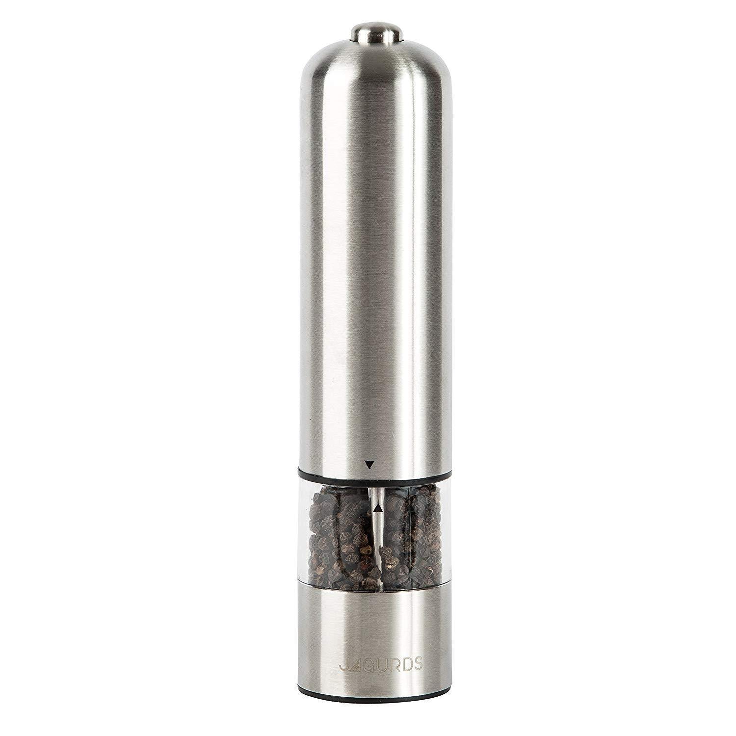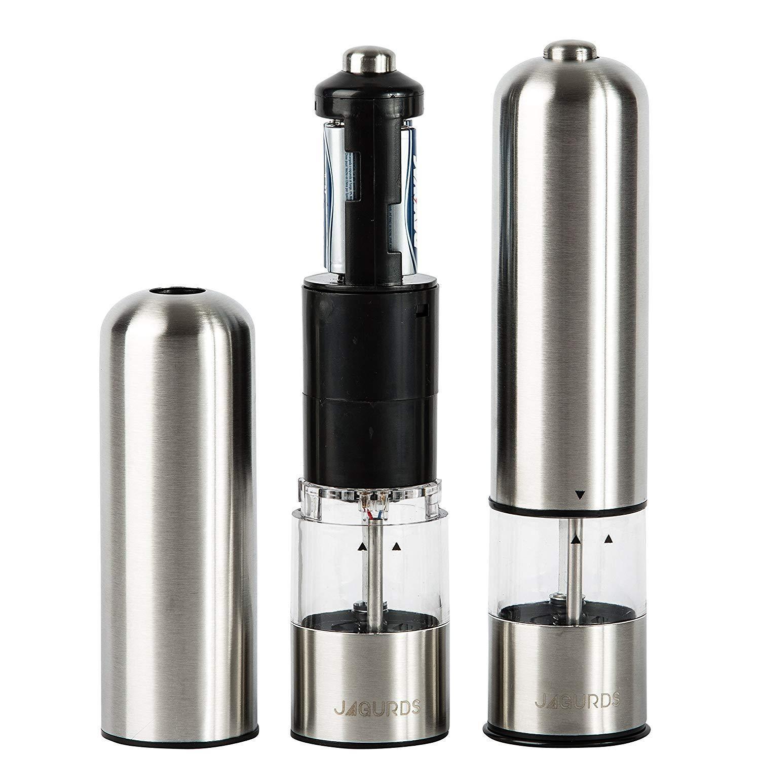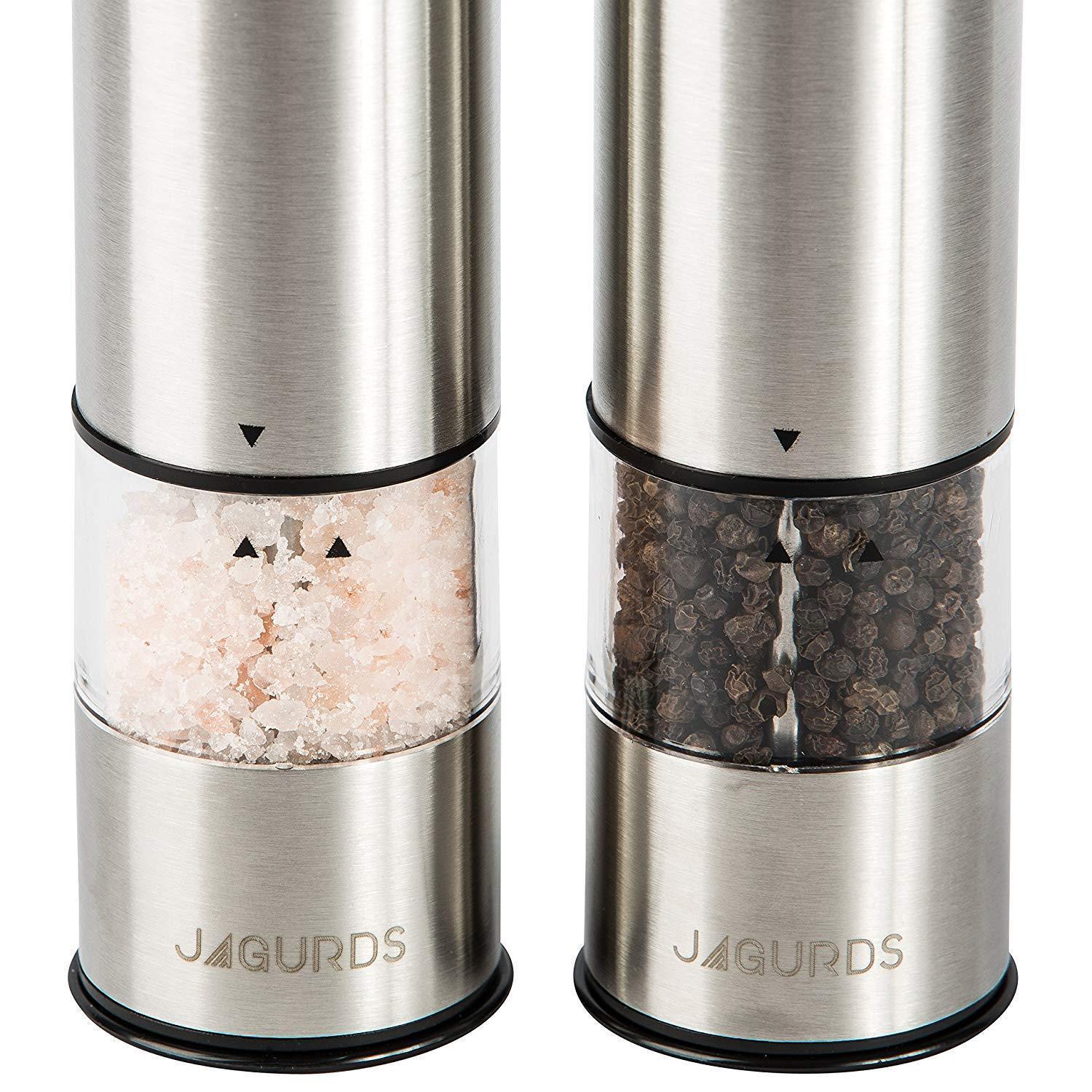 Electric Salt and Pepper Grinder Set - Automatic, Refillable, Battery Operated Stainless Steel Spice Mills with Light - One Handed Push Button Peppercorn Grinders and Sea Salt Mills by JAGURDS