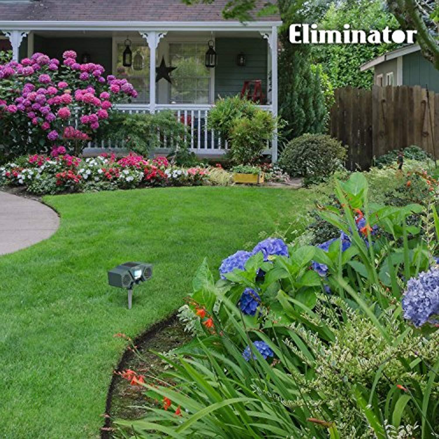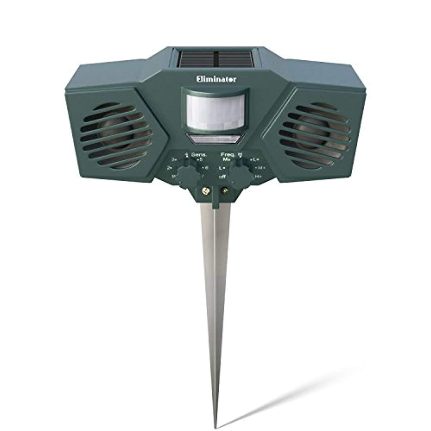 Weatherproof and waterproof. Perfect for yards, patios, porches, boats, gardens, farms, etc. / PIR Motion sensor: Detects motion from up to 30 Ft. / Size: 6” x 3.5” x 2” Permanently eliminate pest problems with this powerful ultrasonic/flashing light animal repeller. Get rid of Cats, Dogs, Deer, Birds (Pigeons, Woodpeckers, Seagulls, etc.), Bears, Squirrels, Rabbits, Skunks, Bats, Rats, Foxes, Raccoons, Mice and much more. The Eliminator pest repeller is extremely powerful and will expel even the most aggressive animals from your property. / Upgraded for top performance.