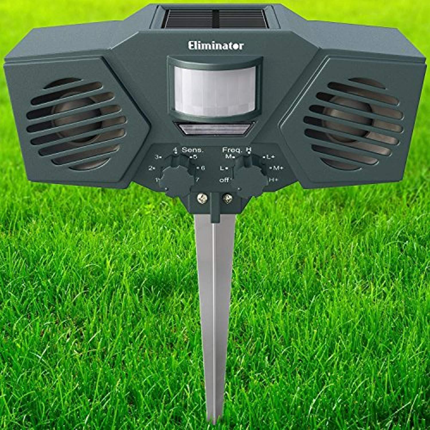 Equipped with an infrared motion sensor; the pest repeller activates when it senses motion. Motion sensor ensures it runs only when needed. No traps, no dead animals, no messy chemicals or pesticides. Get rid of Cats, Dogs, Deer, Bears, Squirrels, Rabbits, Skunks, Bats, Rats, Foxes, Raccoons, Mice, Birds (Pigeons, Woodpeckers, Seagulls, etc.) and much more. The Eliminator pest repeller is extremely powerful and will expel even the most aggressive animals from your property. Features a solar panel on top of the device that recharges the batteries (3 AA rechargeable batteries included). Simply take it out of the box, stick it into the ground with the included metal stake, and select your desired settings (features 3 ultrasonic frequency settings, an optional on/off LED light, and 7 sensitivity settings). Can also be recharged via USB (A USB charging cable is included).