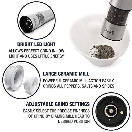 BRIGHT LED LIGHT: At Epare we provide feature-packed kitchen products built to last. We've added a bright LED torch to our powered grinder so you'll be able to see how much seasoning you're adding to your food. Perfect for intimate low-light dinners.