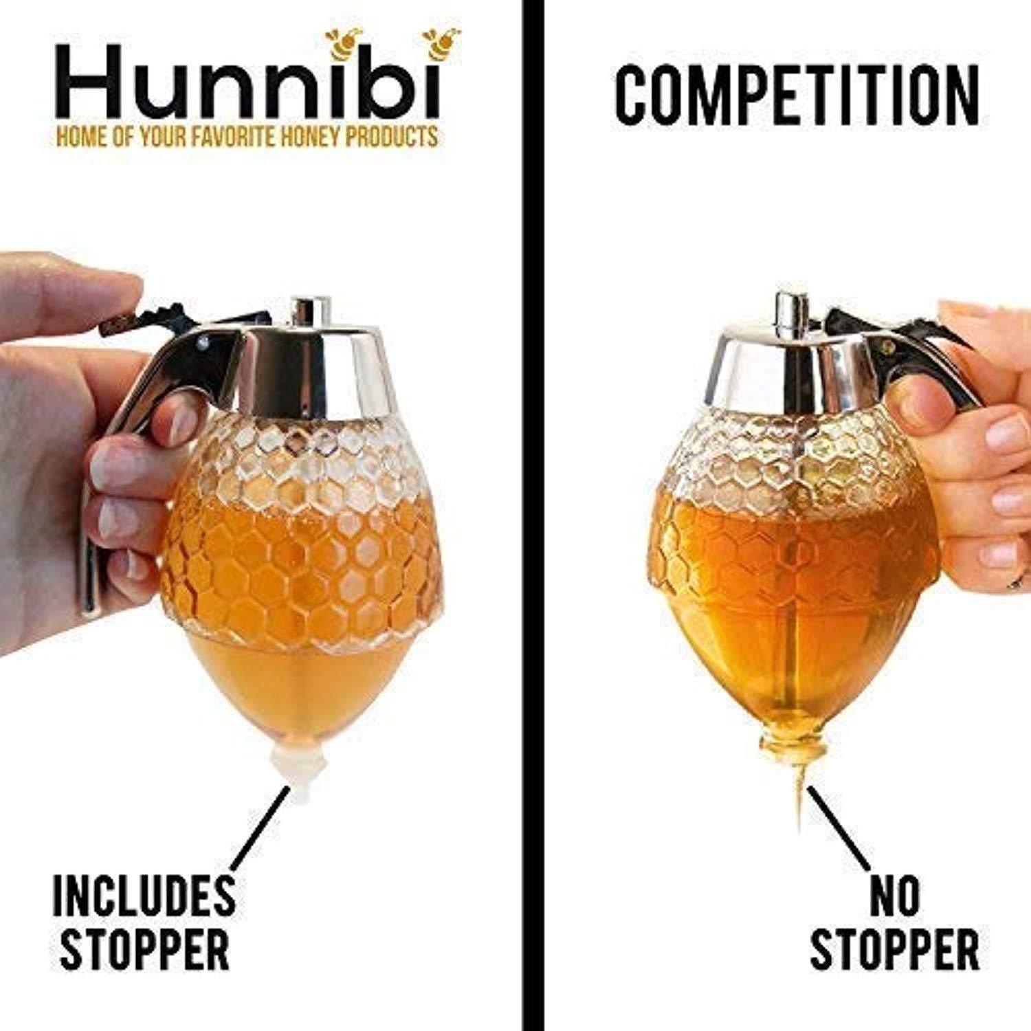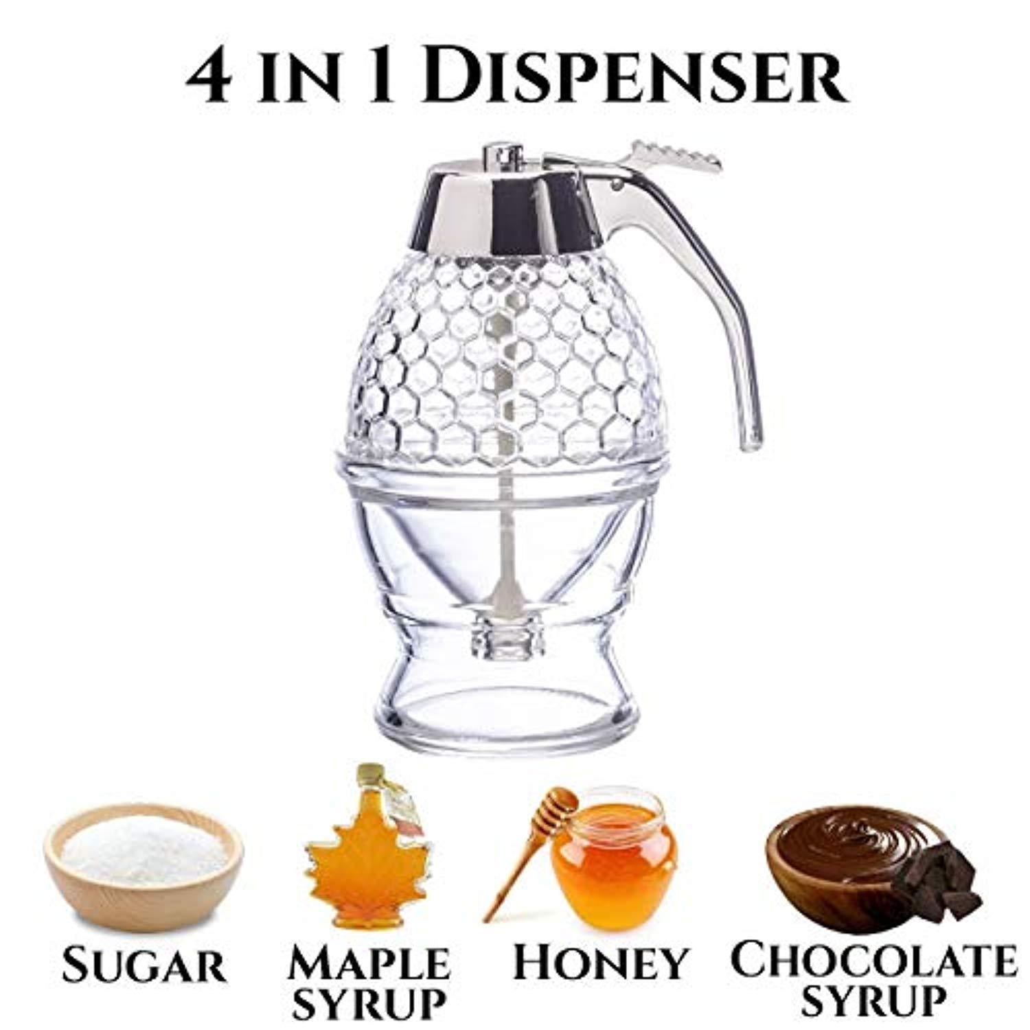 NO-DRIP GLASS HONEY DISPENSER - Stops those messy honey leaks while making your honey immediately available. No waiting and shaking the container to get the honey to start flowing. Simply press the release on the handle and honey instantly flows out the bottom. Let go of the release and honey immediately stops with no drips or messy trails. FULL GLASS HONEY CONTAINER - Shaped into a fun, attractive honeycomb design. This material is light yet strong and durable. Fill the dispenser with honey or similar liquids. Twist on the cap then push the center piece. Honey will start to flow out the bottom. Let go of the center piece and honey stops. This gravity fed system is the ultimate way to have honey that is always ready to pour. HONEY JAR KEEPS HONEY FRESH - Our honey dispenser comes with its very own bottom stopper, keeping your honey server airtight, keeping your honey stored fresh. Use this to put honey in tea, syrup dispenser on pancakes, and even in coffee, without your honey getting clumpy. PERFECT HONEY POT SERVER - Holds 1 cup (8 Ounces) of honey, syrup, chocolate syrup, sugar (yes a sugar dispenser) or any liquid you want (just make sure it's not too thick) PERFECT GIFT - These honey dispensers are going fast. Honey lovers everywhere are snatching these up 2 and 3 at a time. Makes the perfect gift for family, friends, and co-workers.