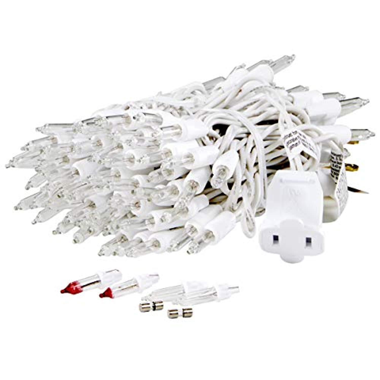 White Wire: 21.5 Total Length Per String Set 2.5" spacing; Spare bulbs & fuses included Bulbs remain lit even if one burns out UL certified to connect up to 5 sets