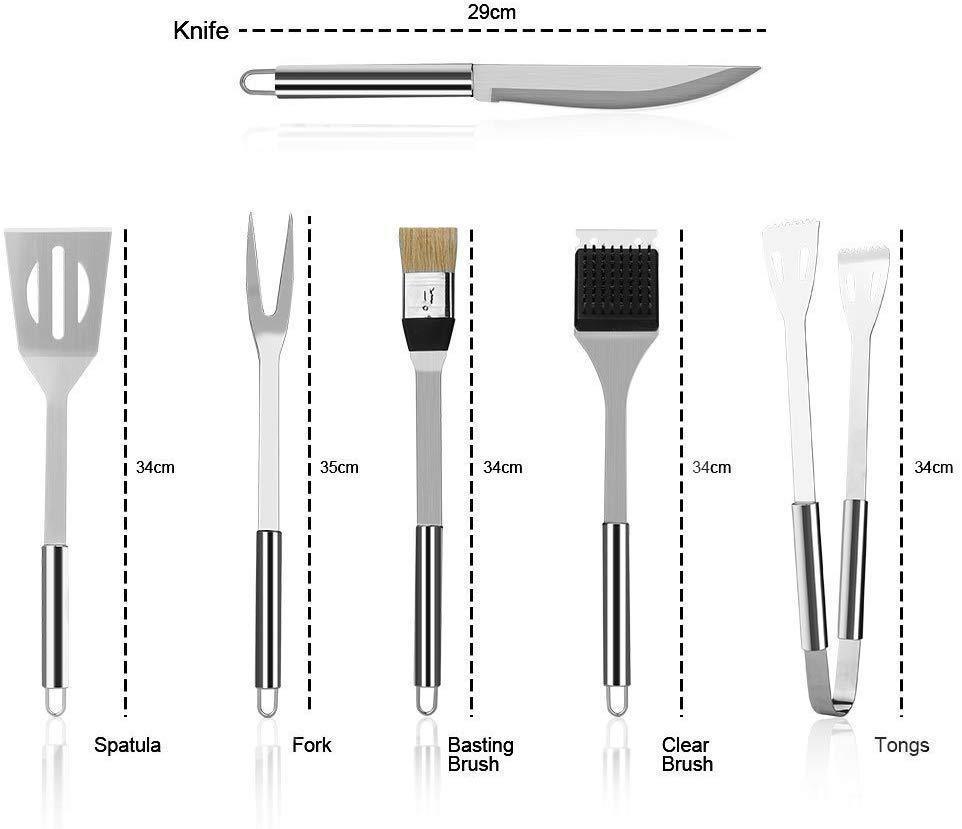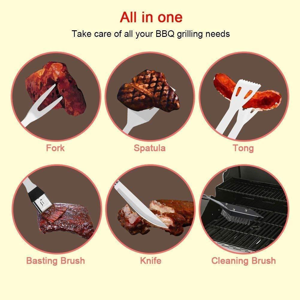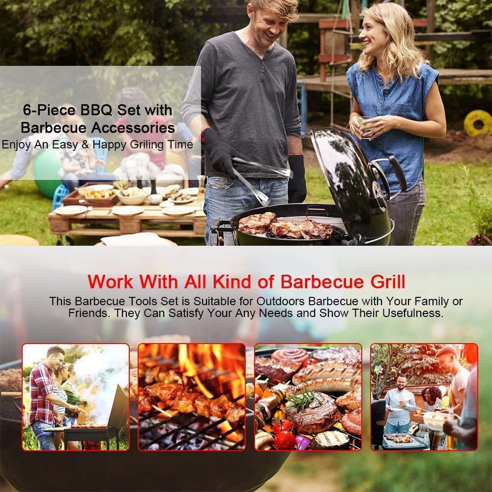 ✔Perfect Experience: Our grill tool kits are 6 piece-fork, spatula, tong, basting brush, knif and cleaning brush, included all necessory tools for BBQ. Right length of hand shank make huge reach to the back of the grill without stretching your arms, protection you from burn. Easy cut and stab meet, chicken and other food. So you can enjoy your barbecue party with our grilling tools set with your friends and families