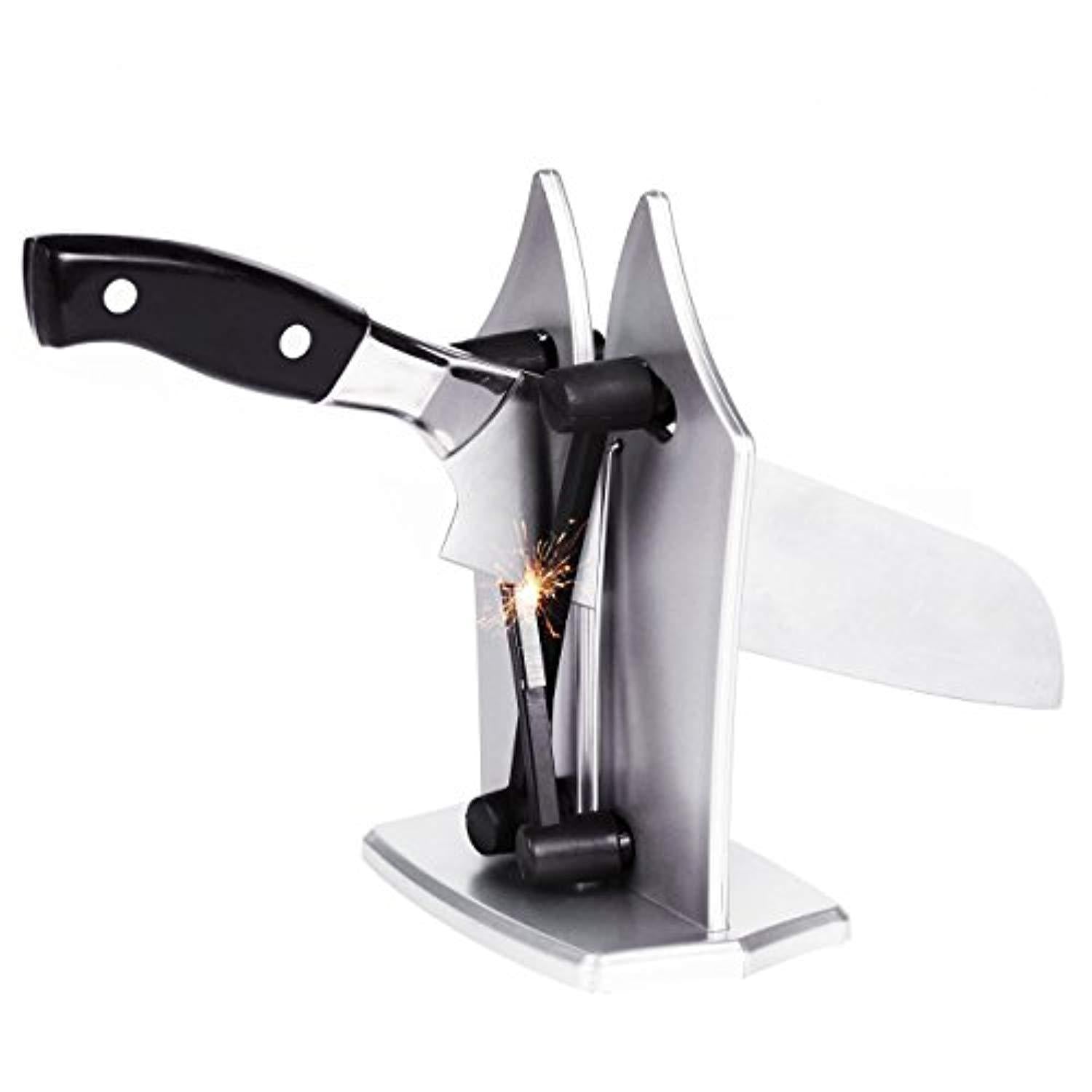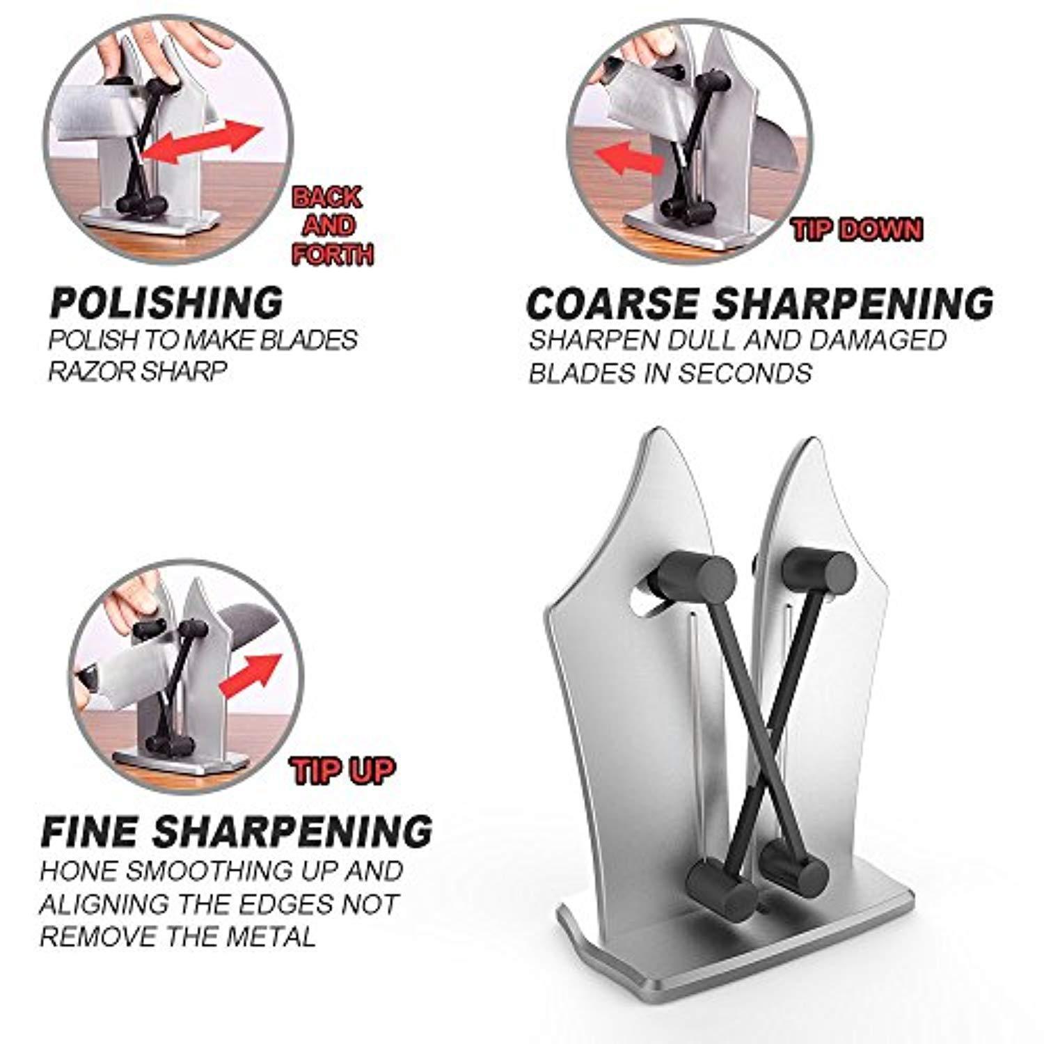 【EASY TO USE】- Simply pull your blade back and forth through kitchen knife Edge,sharpen your knife razor sharp in seconds. 【SHARPEN KNIVES IN SECONDS】- With Razor sharp edge.Only seconds to sharpen dull knives. 【SHARPEN,HONE,POLISH VARIOUS KNIVES】- Two independent angle adjustable spring action arms make it easy to sharpen different kinds of knives,for example,Japanese single bevel blades,Chef's Knives, Pairing Knives and so on. 【KNIFE SAVER】- Made of Ultra-hard Tungsten Carbide that flex and contour to many Old, dull even serrated blades.You don't have to buy new one, buy one sharpener save all. 【DURABLE CONSTRUCTION】- With 2 solid stainless steel.This sharpeners made of ultra hard tungsten carbide can using for 5 years.