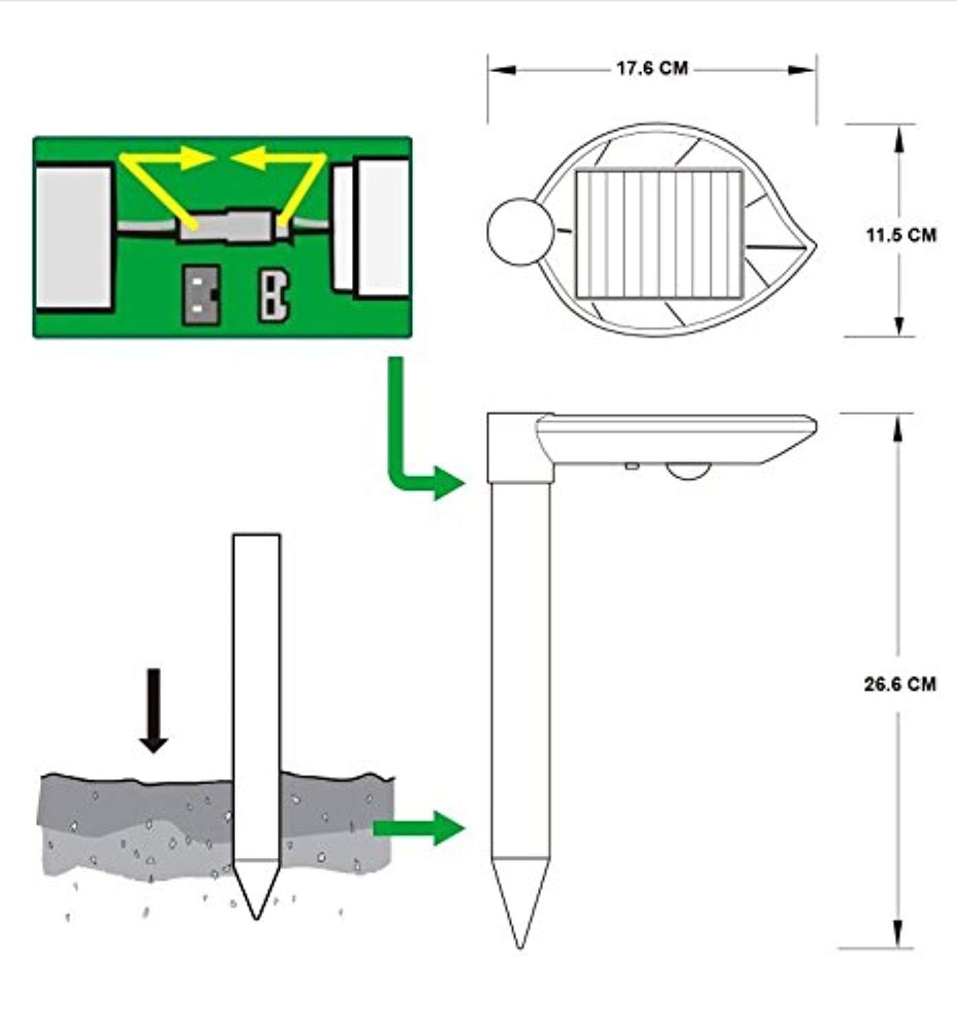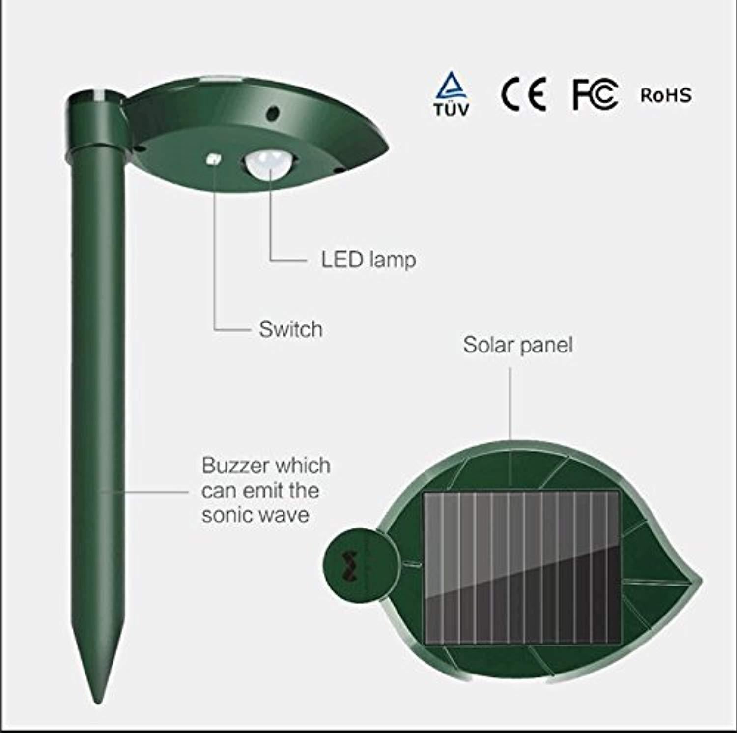 THEORY: This Upgraded Solar Snake repellant Ultrasonic Outdoor vibrates and emits 400-1000 HZ variable low-frequency sonic pulses every 40-50 seconds to repel burrowing rodents living underground. It is safe for use around pets and children. No chemicals, no poison, no sprays or traps, no dead animal; Application: Farm, Garden, Park, Lawn, Yard, etc. Repel: Mole,Snake, Rodent, Rat, Gopher.