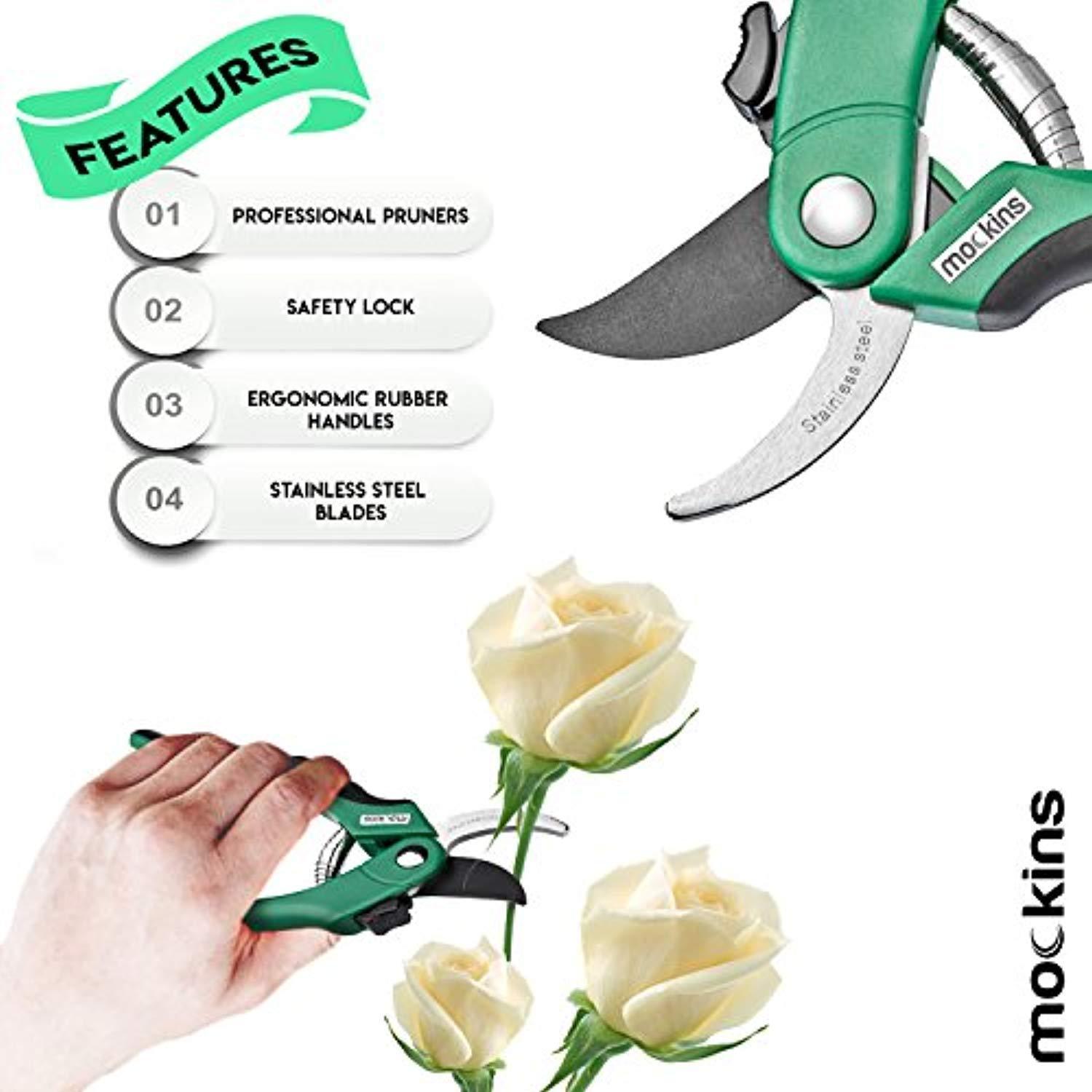 ✂PROFESSIONAL PRUNERS are recommended by gardeners and first time users. the garden clippers are Ideal for plants , flowers and bushes or herb scissors great gardening tools is a must have clipper ✂SAFETY LOCK branch cutter designed with you in mind. Easy to use for garden tools especially for small hands ✂ERGONOMIC RUBBER HANDLES yard tools for a pain free experience with comfort and ease. Say goodbye to arthritic pain! ✂STAINLESS STEEL BLADES for an effortless clean cut garden shears pruning floral snippers