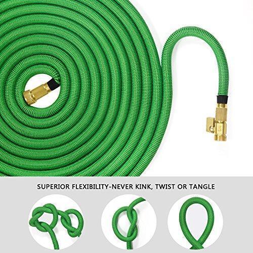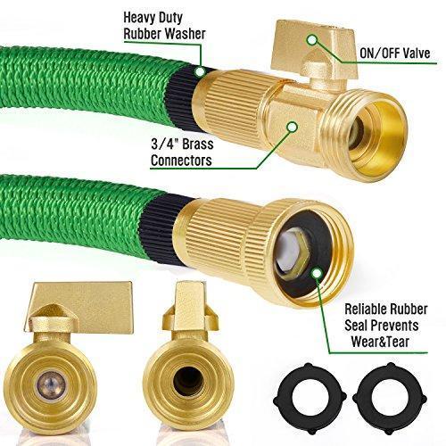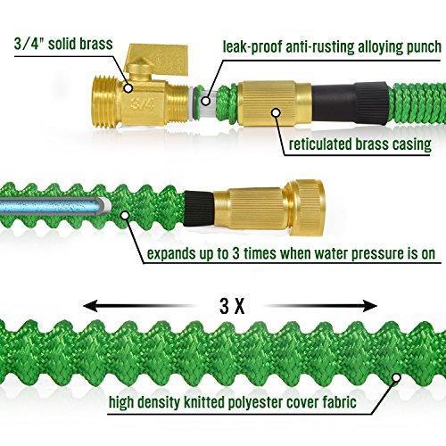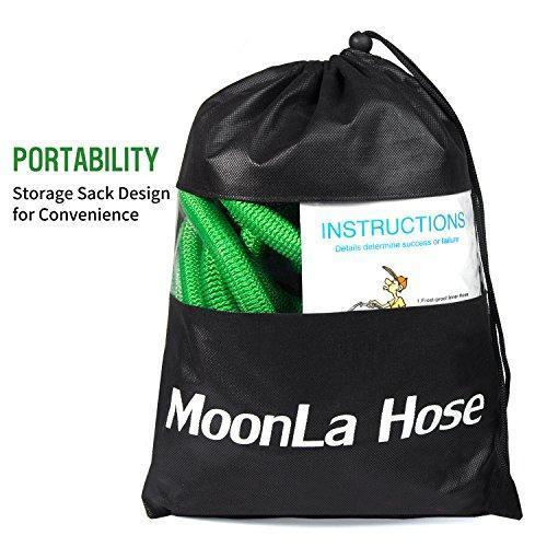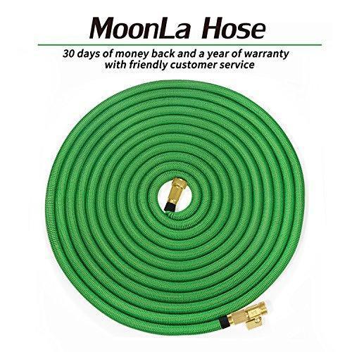 MOST ADVANCED GARDEN HOSE ON THE MARKET - Made from the highest-quality materials & latest design. Made it quite functional, lightweight, flexible. The expected life of our MoonLa expansion hose is 30% longer comparable to other regular hoses. DURABLE & NO MORE LEAKS - Solid 3/4 Inches brass connectors, rubber washer, double latex pipe, sturdy on/off valve and extra-flexible 3750D polyester fabric cover.It perfectly solves the leak problems. Never tangle, twist or kink. FLEXIBLE DESIGN - This expandable hose starts out from 17 Feet; when the water is turned on the hose quickly expands up to 3 times in length (50 Feet) with the water pressure (3-12 Bar) and returns in minutes to its original length when draining off water. Just make sure there is enough water pressure to expand the hose. SUPER EASY TO USE & STORE - Usage and storage is a breeze thanks to the incredible expanding design. Comes with a free storage sack - simple way to save your storage space. Just drain water from the hose when not in use, put in the bag and store out of direct sun. 100% MONEY BACK GUARANTEE - 30 days of money back and a year of warranty with friendly customer service. If you ever have any issues with your MoonLa Hose, simply contact us and we'll expedite you a new one absolutely free or refund your payment in full!