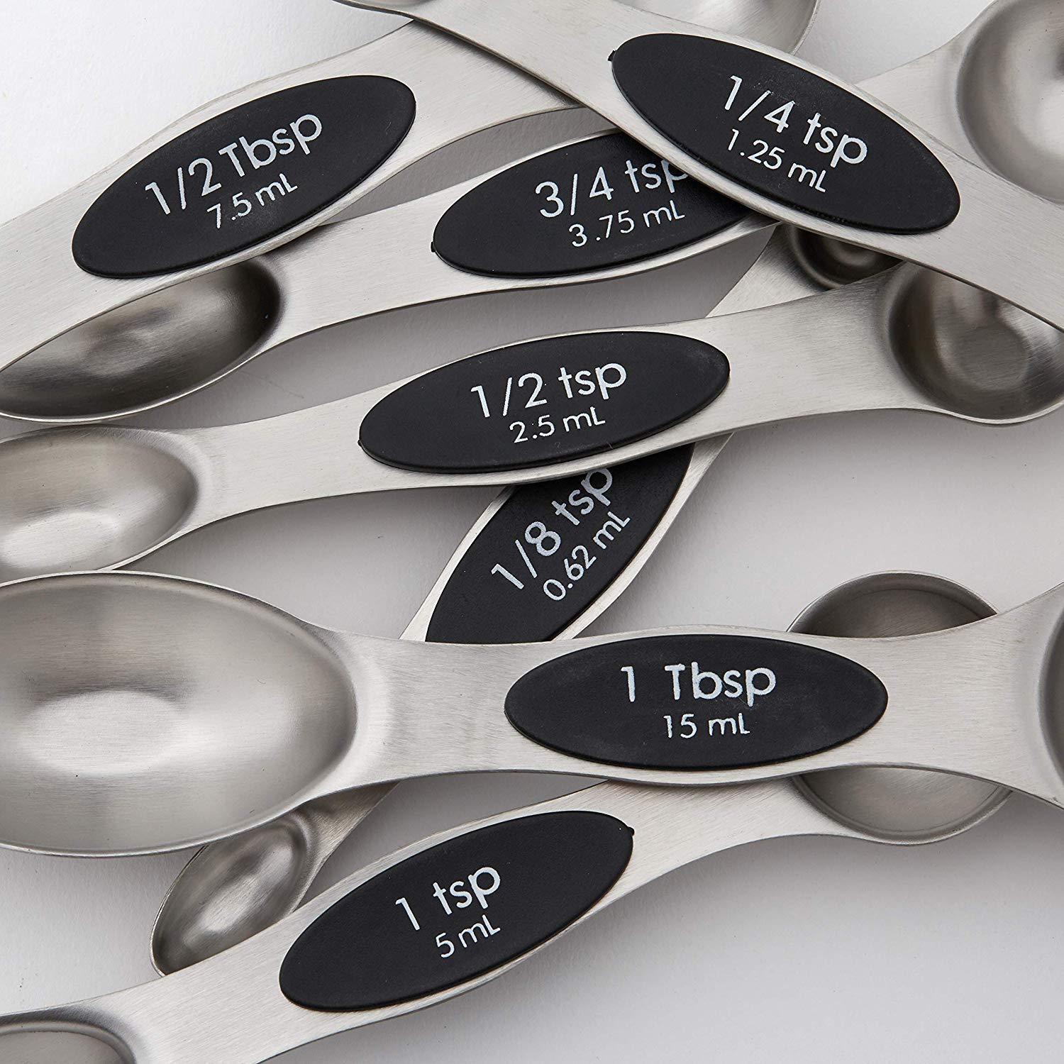 TREAT YOURSELF TO A SET WORTH HAVING - With single metal construction and heavy duty premium Stainless Steel, these measuring spoons were built with endurance in mind. No more worrying about rusting or bending. Get this set that looks beautiful, performs incredibly and will seemingly last forever. MAGNETIC FOR EASY USE AND STORAGE - These magnetic spoons let you use one spoon at a time and then they nest together for easy storage. Quickly grab the spoon you need without having to fumble with opening and closing a ring. They even have U.S. and metric measurement markings that are easy to read and won't fade or rub off. You'll wonder how you ever lived without them.