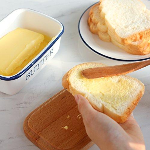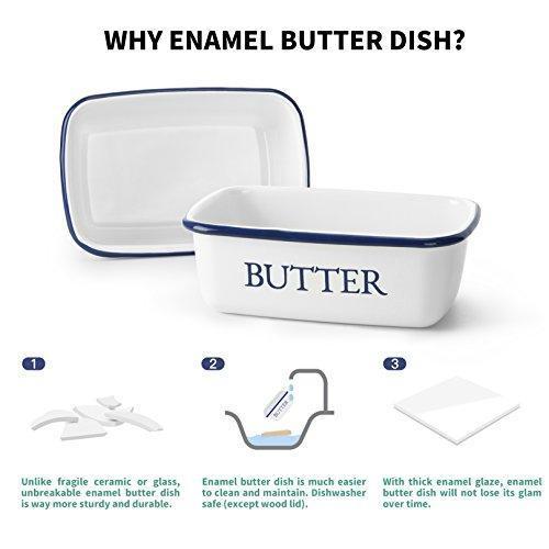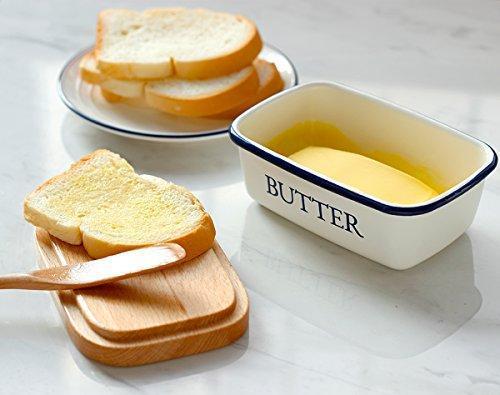 HANDMADE ENAMEL CRAFT – Proudly handmade enamel butter dish with a cute wood lid, which brings a retro style to your counter. Unlike fragile ceramic or glass, unbreakable enamel butter dish is way more sturdy and durable. Originally designed by SveBake. PERFECT SIZE – Measures 6 x 3.9 x 2.5 inches. No matter what style of butter you like, this butter dish meets all your needs. Perfectly fits 2 sticks of East Coast butter or 1 cube of West Coast/European butter. Suitable for most brands’ butter like Kerrygold, Land O'Lakes, Organic Valley etc. MORE THAN A BEECHWOOD LID – Each natural beechwood lid comes with the different grain, which makes it unique and elegant. Simple but functional, the lid can double as cutting board or serving board. (The lid is hand wash ONLY) DEFINITELY EYE CATCHER - Unique butter dish match with Enamel and Wooden lid, which bring a new twist to your counter. Attractive navy blue rim and word “butter” make it a stylish vintage counter addition. IDEAL GIFT CHOICE - Packed in an exquisite gift box. Everyone deserves a chic enamel butter dish! Ideal gift for yourself, family, friends or anyone you love.